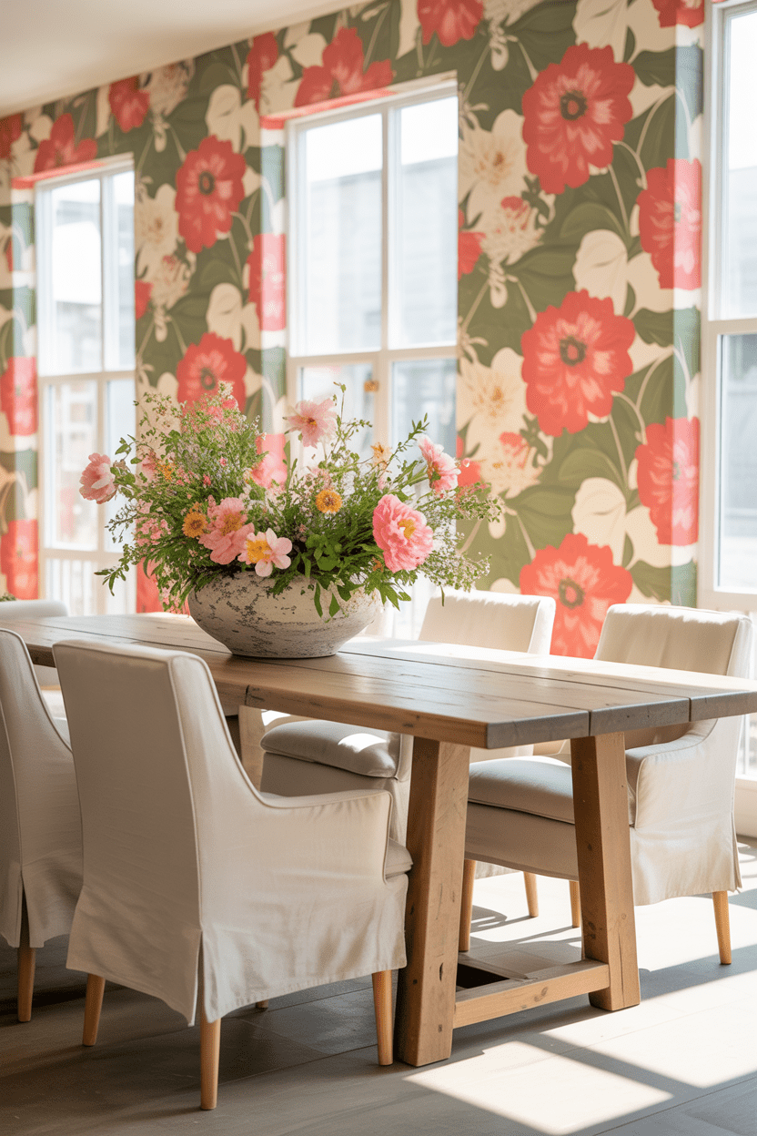 Floral wallpaper dining room moments never fail. Whether you go bold and blooming or soft and romantic, florals bring so much personality. I especially love them behind a buffet or hutch—they frame the space beautifully.