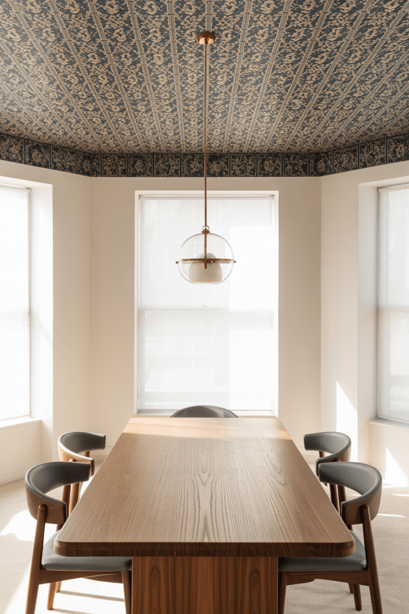 If you really want to surprise people, wallpaper the ceiling. Yes—the ceiling. Ceiling wallpaper dining room designs add instant character, especially when you choose subtle patterns or metallics. It’s unexpected in the best possible way.