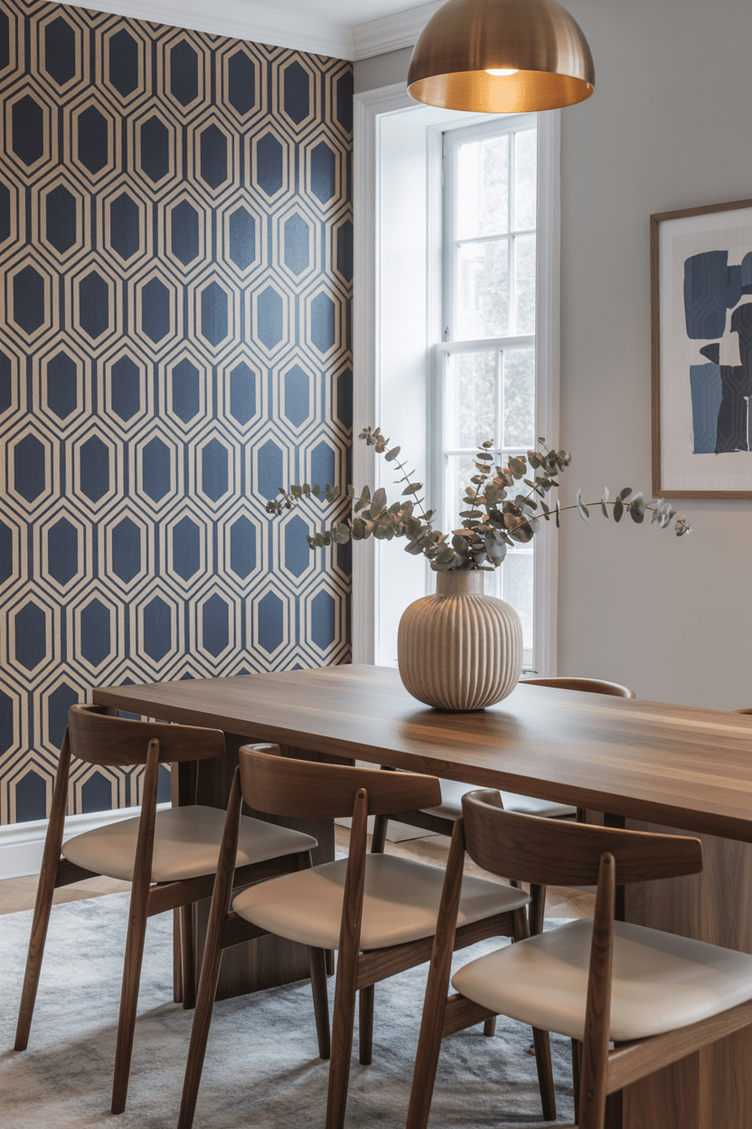 A wallpaper dining room accent wall is perfect if you’re dipping your toes in. One patterned wall—especially behind the table—can set the entire tone of the room without feeling overwhelming.
