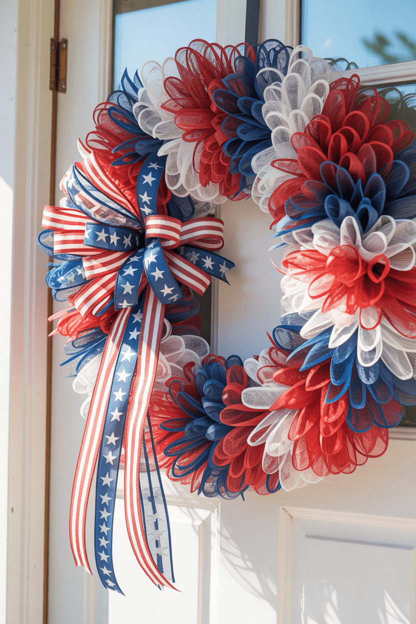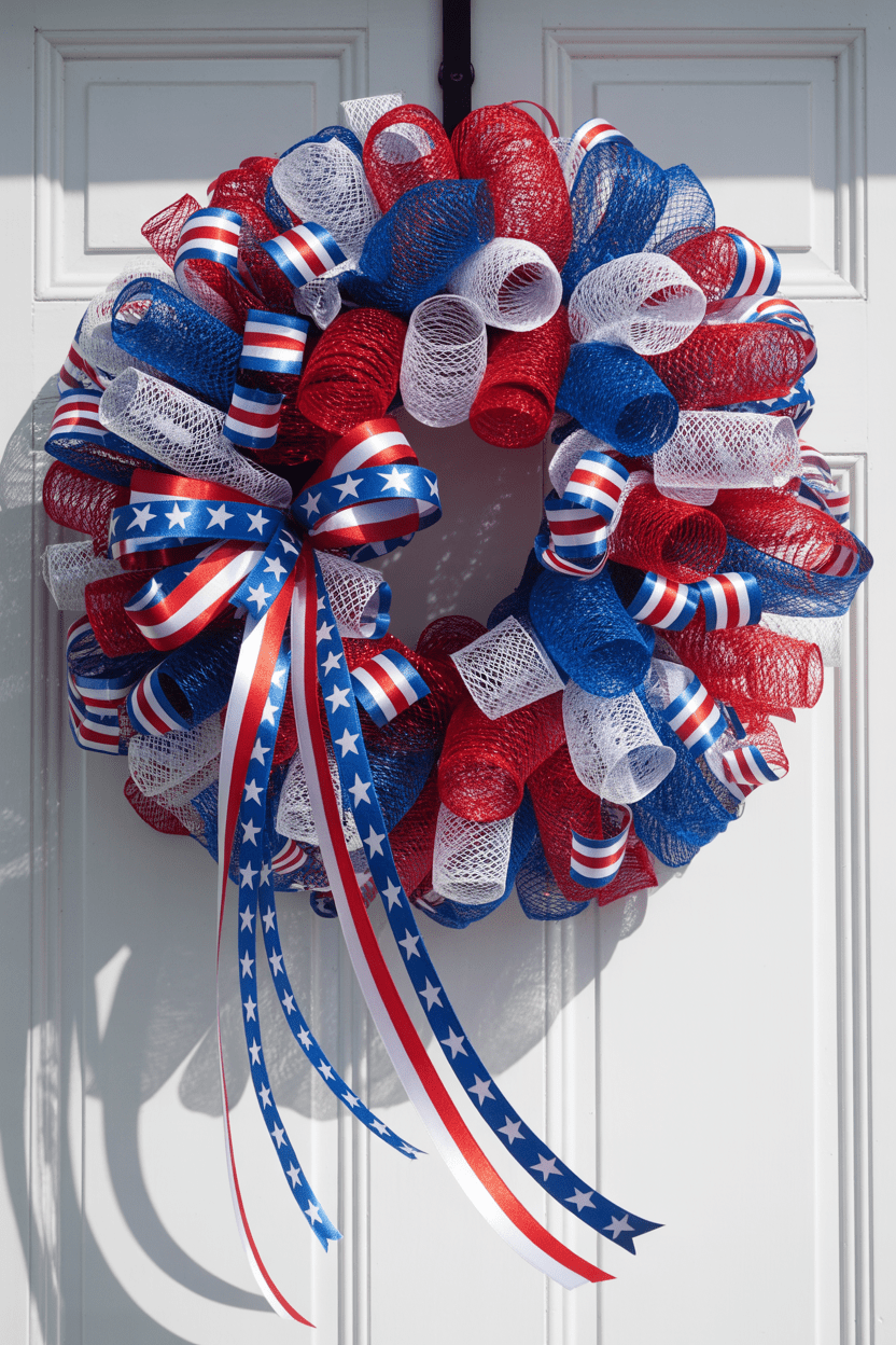 If you want your Memorial Day wreath to stop people in their tracjs, this is it. An oversized patriotic deco mesh wreath layered with red, white, and blue mesh creates dramatic volume that looks incredible on a front door. I love adding star-spangled ribbon tails and oversized bows to make it feel extra festive. This style works beautifully for Memorial Day outdoor decor because it holds its shape and stands out from the street. To achieve this look, layer mesh loops tightly around a wire wreath form, alternating colors for maximum impact, then finish with a large patriotic bow and dimensional star picks.