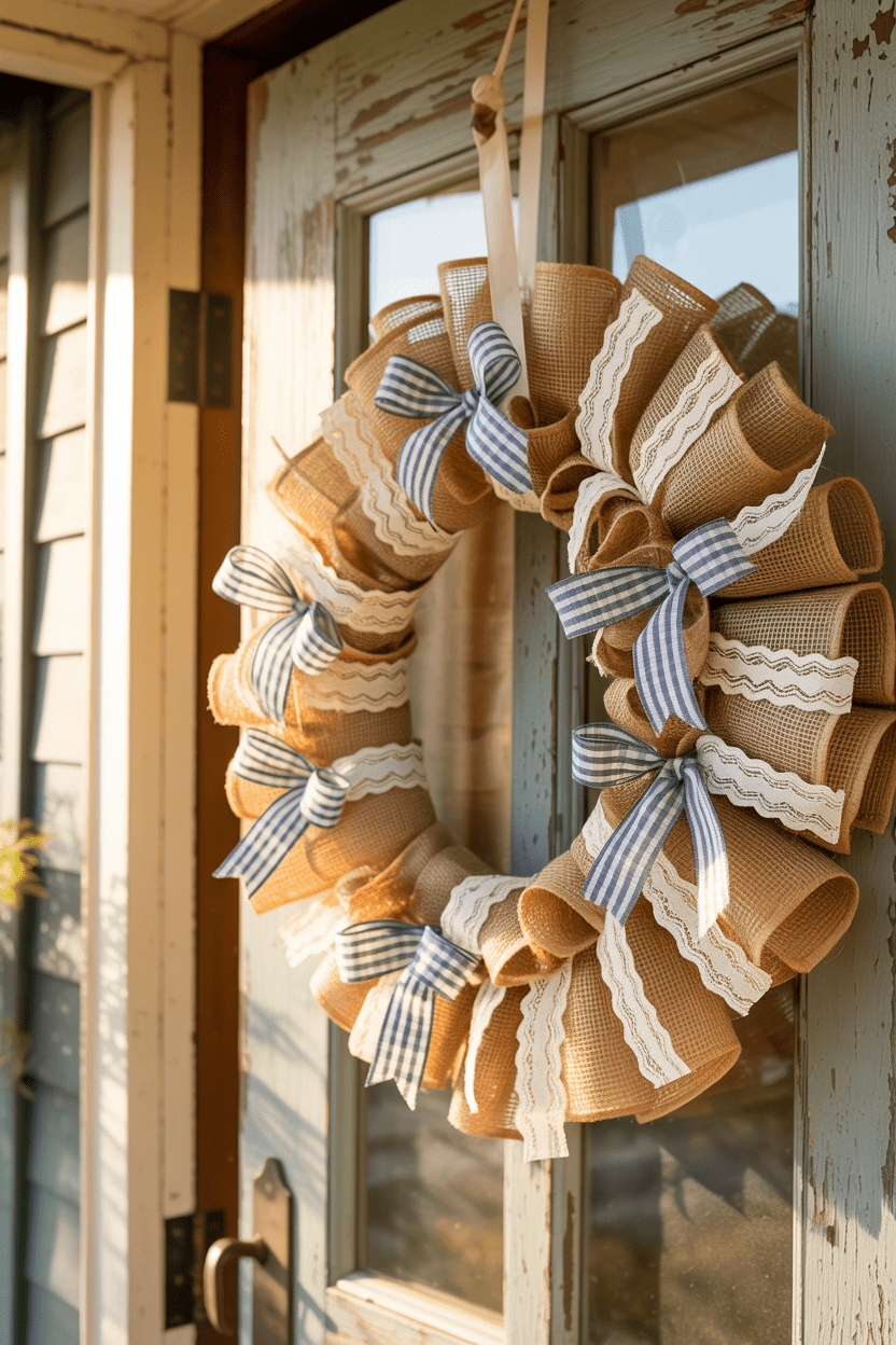 Burlap adds rustic texture while lace softens the look, and when combined with navy ticking stripe ribbon, the result feels cozy and farmhouse-inspired. This wreath works wonderfully for vintage Memorial Day decor and complements neutral front porch settings. Keep the florals minimal to let the textures shine.