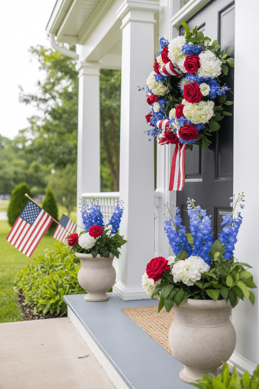 I always say your wreath shouldn’t stand alone. Pairing it with coordinated Memorial Day flower arrangements in planters instantly elevates your front porch Memorial Day decor. Choose flowers that mirror the colors in your wreath so everything feels cohesive and intentional rather than random.