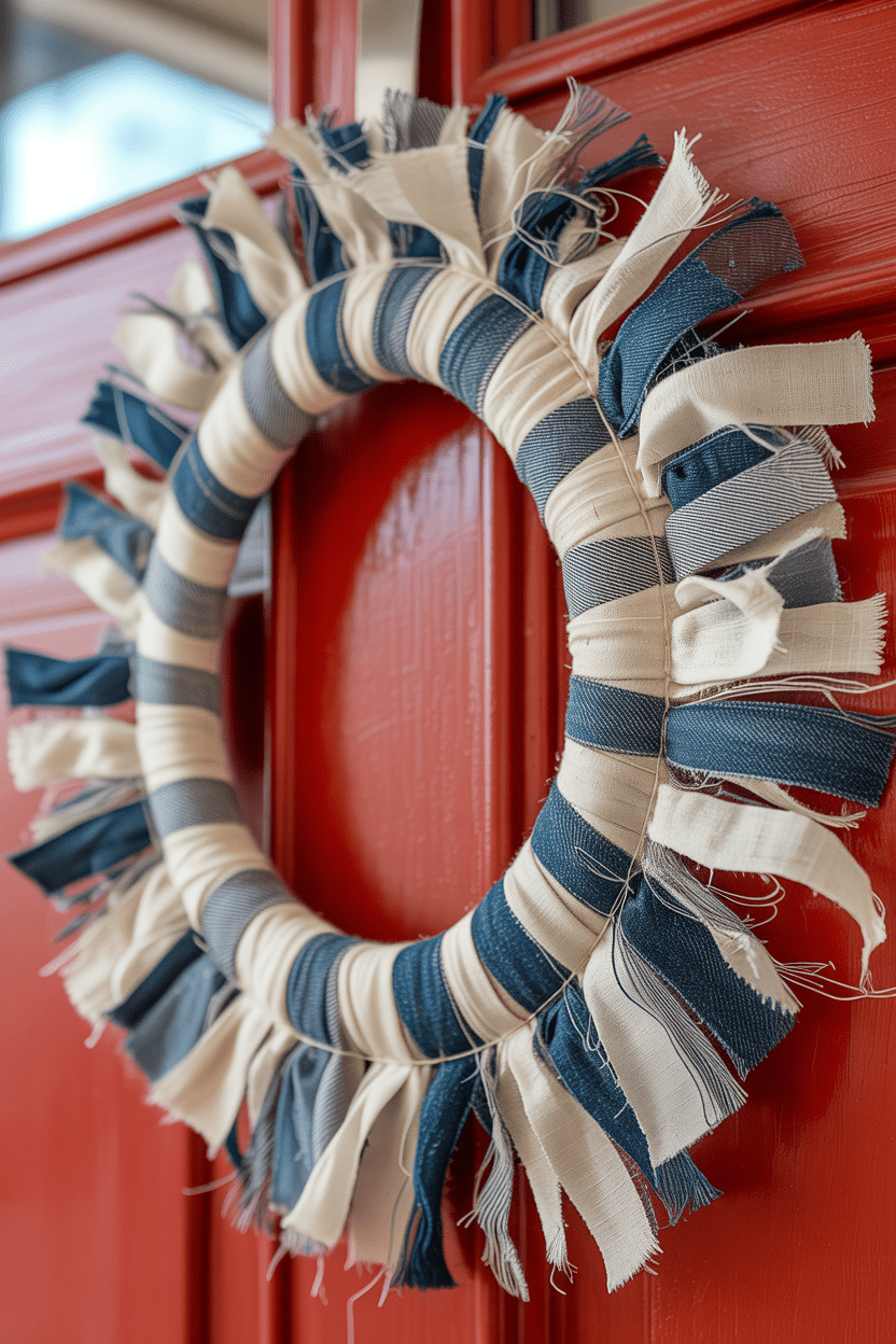 Tie strips of denim, muslin, and ticking stripe fabric around a wreath frame to create a textured, rustic look that feels handcrafted. This is a beautiful example of DIY decor that brings personality and warmth to your porch. The mix of fabrics adds visual interest without relying on heavy embellishments.