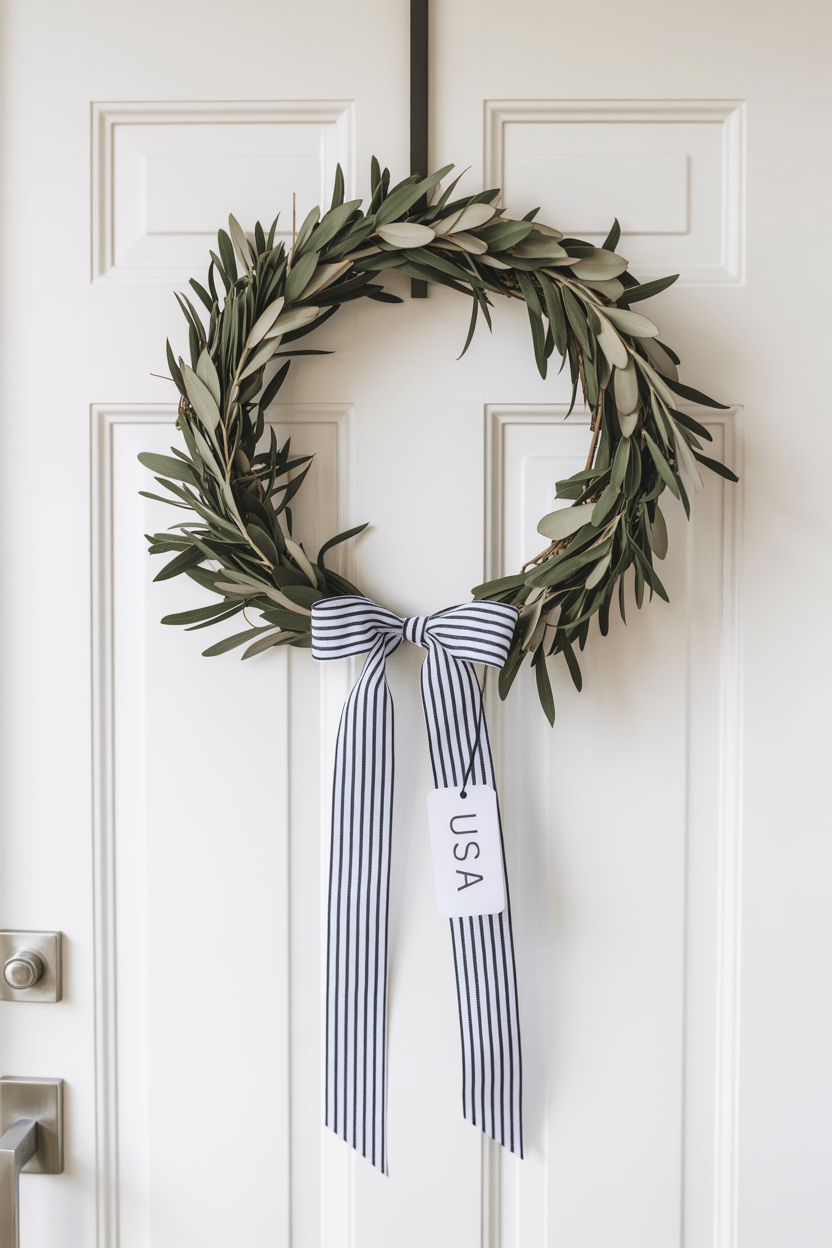 If your style leans clean and neutral, try a simple greenery wreath with a black-and-white striped ribbon and a small “USA” tag. This nods to Rae Dunn Memorial Day decor while keeping your Memorial Day home decor feeling modern and uncluttered. It’s perfect if you prefer subtle patriotic touches.