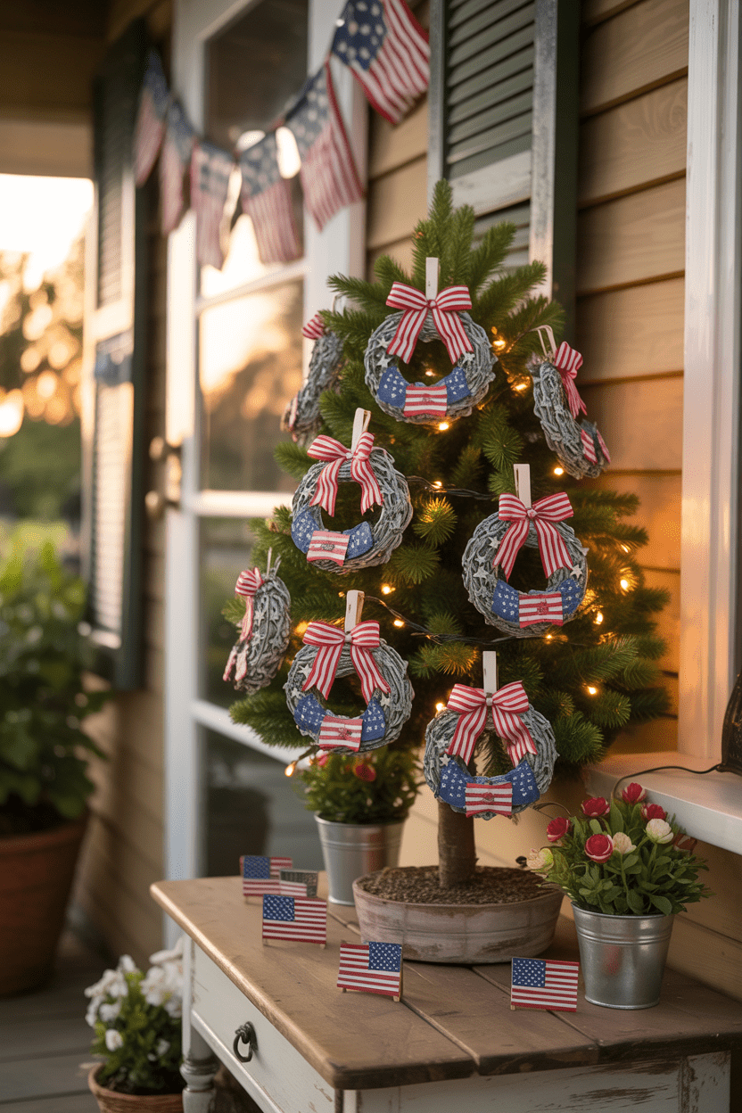 Yes, a Memorial Day tree can absolutely work! Hang mini patriotic wreaths on a small tabletop tree for front porch styling. This idea is ideal for Memorial Day party decor and creates a fun focal point that guests will notice right away.