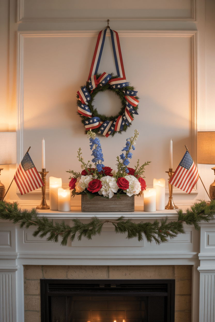 Bring the wreath indoors by styling a smaller version above your mantel. Pair it with matching garland and Memorial Day centerpieces so your fireplace decor feels just as intentional as your front porch. Repeating colors and materials ties everything together beautifully.