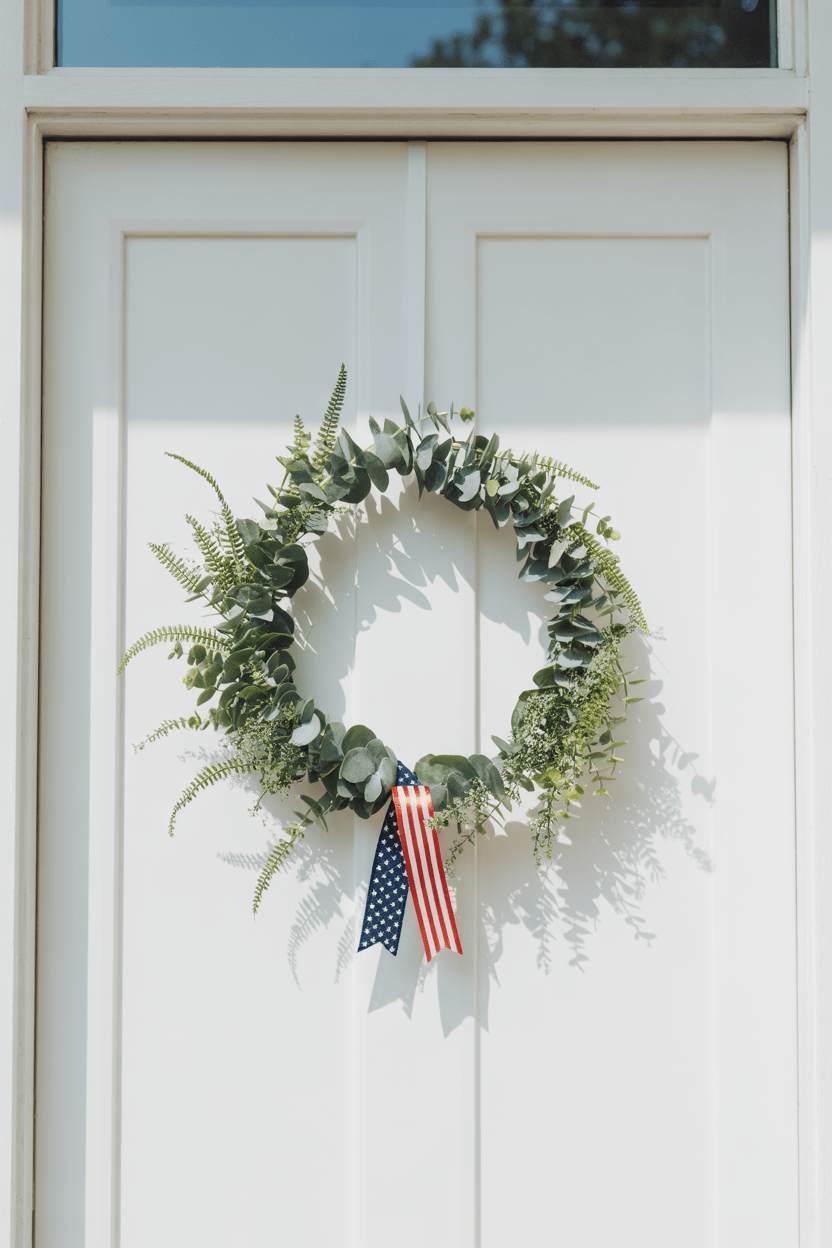 If bold isn’t your thing, a greenery wreath with a single folded flag ribbon is timeless and elegant. This understated option works beautifully as Memorial Day home decor and transitions seamlessly into summer, making it a versatile choice for your front door.