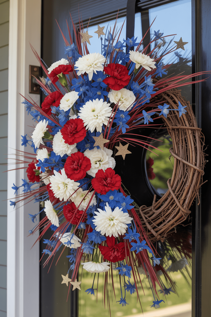 This wreath mimics the look of fireworks exploding in the night sky. Clusters of red carnations, white mums, and blue delphinium radiate outward to create movement and texture that instantly elevates your Memorial Day decor. It feels celebratory while still honoring the spirit of the holiday. Start with a grapevine base and build outward in sections to create that burst effect, securing stems tightly so the shape stays bold and full. Metallic star accents add just the right amount of sparkle for eye-catching Memorial Day home decor.