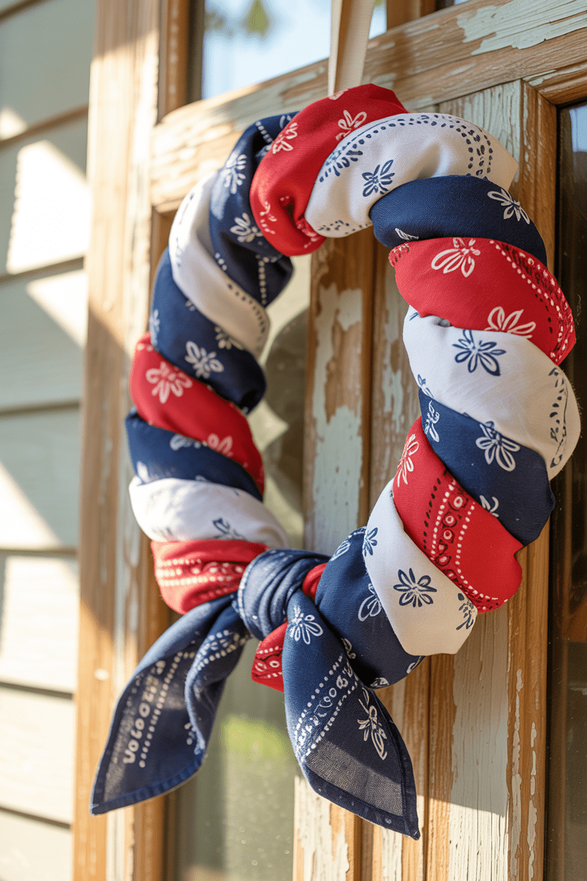 I absolutely love a good patriotic wreaths DIY moment, and this one is so approachable. Cut red, white, and blue bandanas into strips and tie them snugly around a wire wreath form to create a thick, textured look. This idea works especially well for Memorial Day decor because it’s affordable, beginner-friendly, and easy to customize. The layered fabric adds softness and movement, which makes it beautiful for front porch Memorial Day decor and outdoor photos.