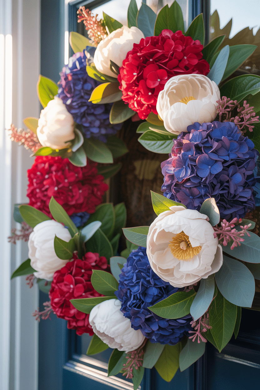 If you prefer something more elevated, a floral-heavy wreath feels instantly luxurious. Large hydrangeas and peonies in red, white, and soft navy create fullness while still looking refined. This is perfect for patriotic flowers for wreaths and makes your Memorial Day porch decor feel styled rather than overly themed. I recommend using an asymmetrical design, keeping most of the florals to one side and balancing with greenery for a modern finish.