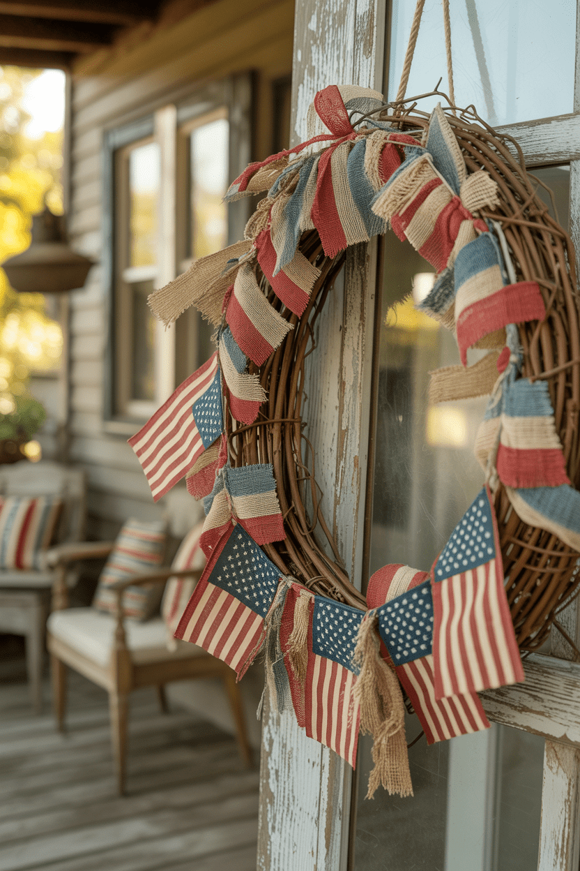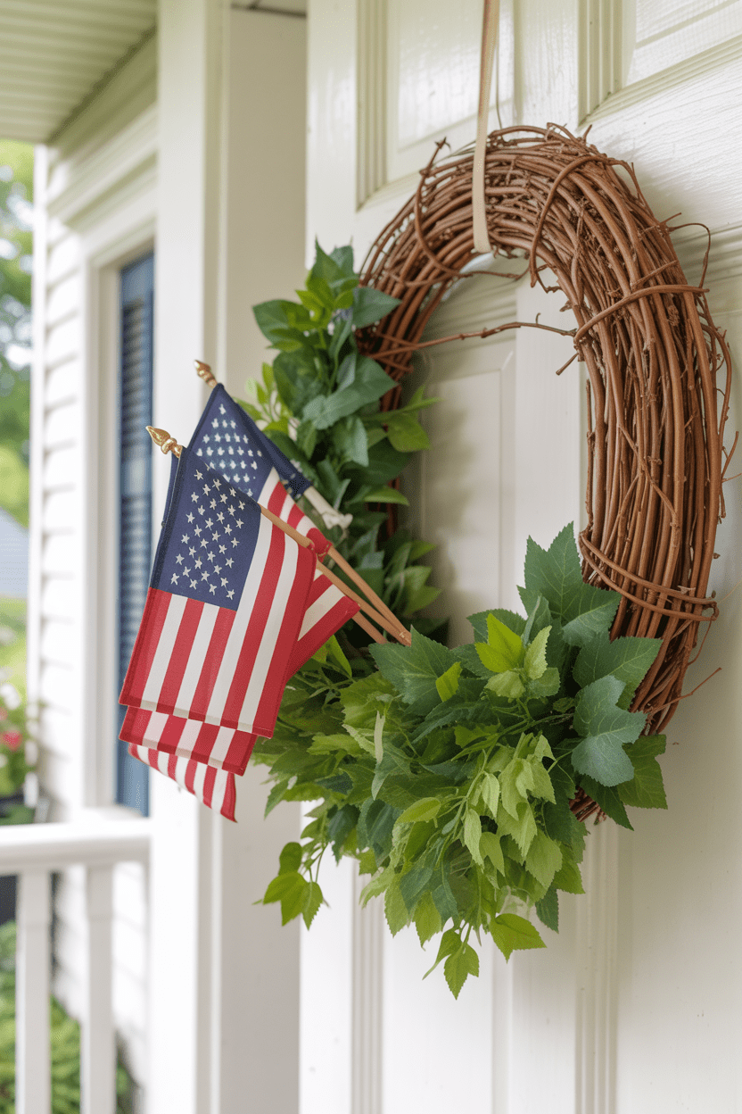 Sometimes simple is best. A grapevine wreath with small layered American flags tucked throughout greenery feels traditional and timeless. This is a classic option for patriotic wreaths for front door styling and pairs beautifully with yard decor like matching planters or subtle flag accents along your walkway.
