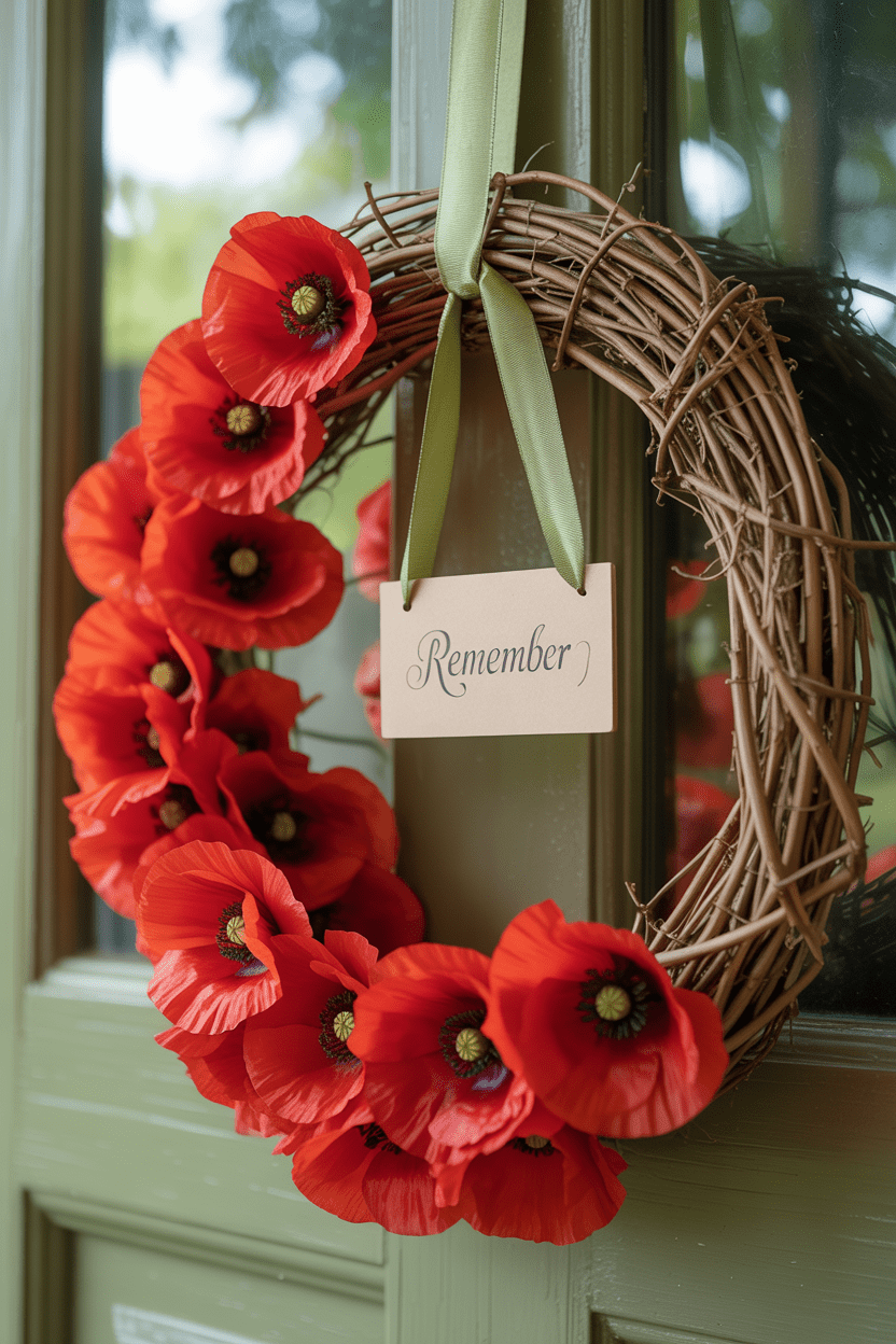 Red poppies symbolize remembrance, which makes this one of the most heartfelt Memorial Day wreath ideas. A simple grapevine base with clustered poppies and a small remembrance tag keeps the focus meaningful and elegant. This style fits beautifully with Memorial Day remembrance decor and works well if you prefer something understated but powerful on your front porch.