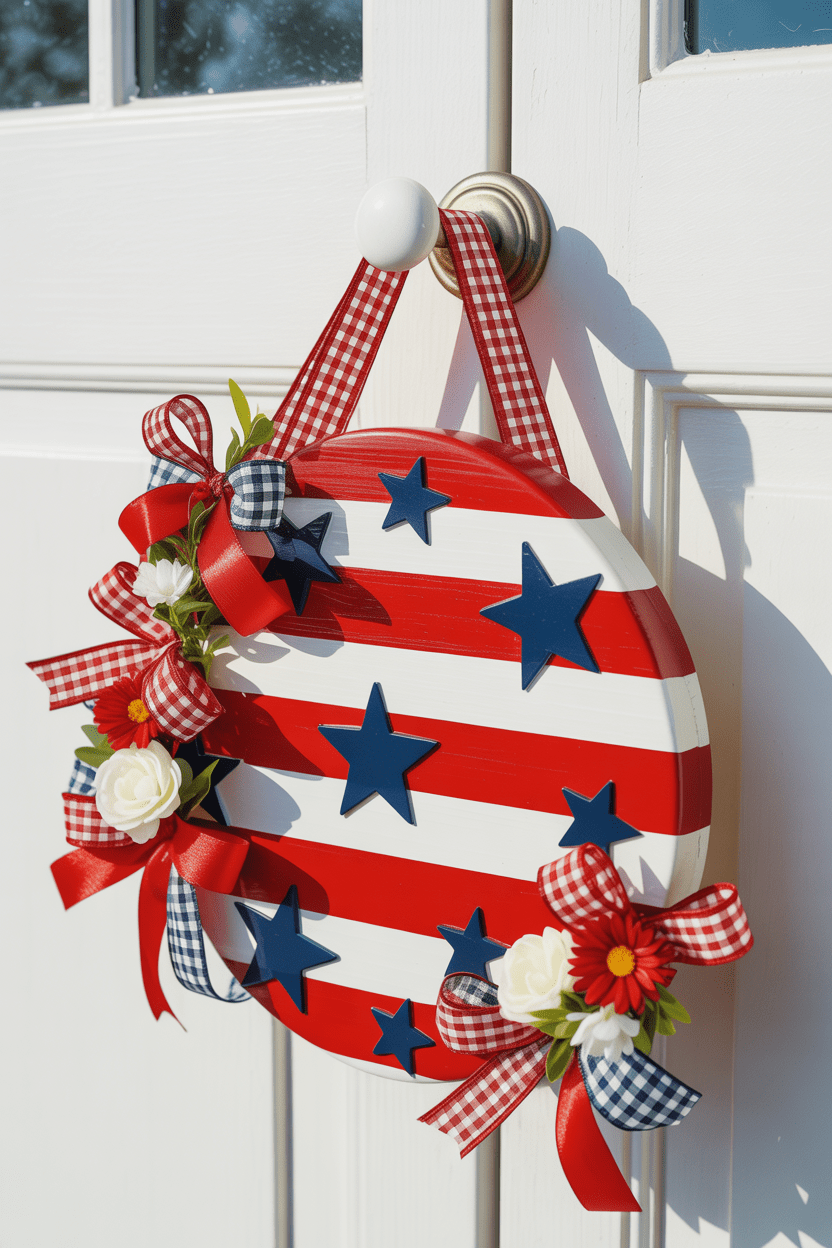 A painted wooden round featuring patriotic stripes or stars layered with florals and ribbon gives you the best of both worlds: door hanger and wreath. This idea works perfectly for Memorial Day and adds a bold graphic element to your porch decor. Be sure to seal the wood properly if you’re using it so it stays vibrant all season long.