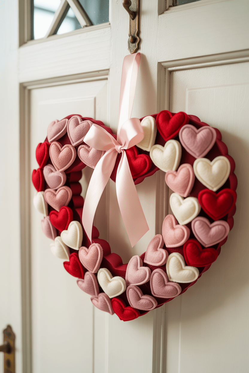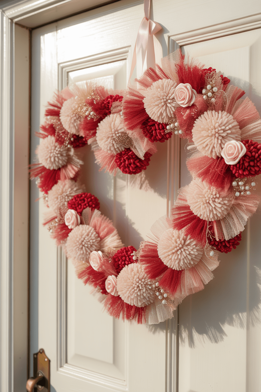 Nothing says cozy romance like a fluffy Valentine heart wreath. This soft, textured design can be made from yarn, tulle, or pom poms shaped into hearts. It’s cheerful, eye-catching, and has that handmade charm I absolutely love. Try mixing blush pink, creamy white, and deep red for a cozy, layered look that feels straight out of a storybook.