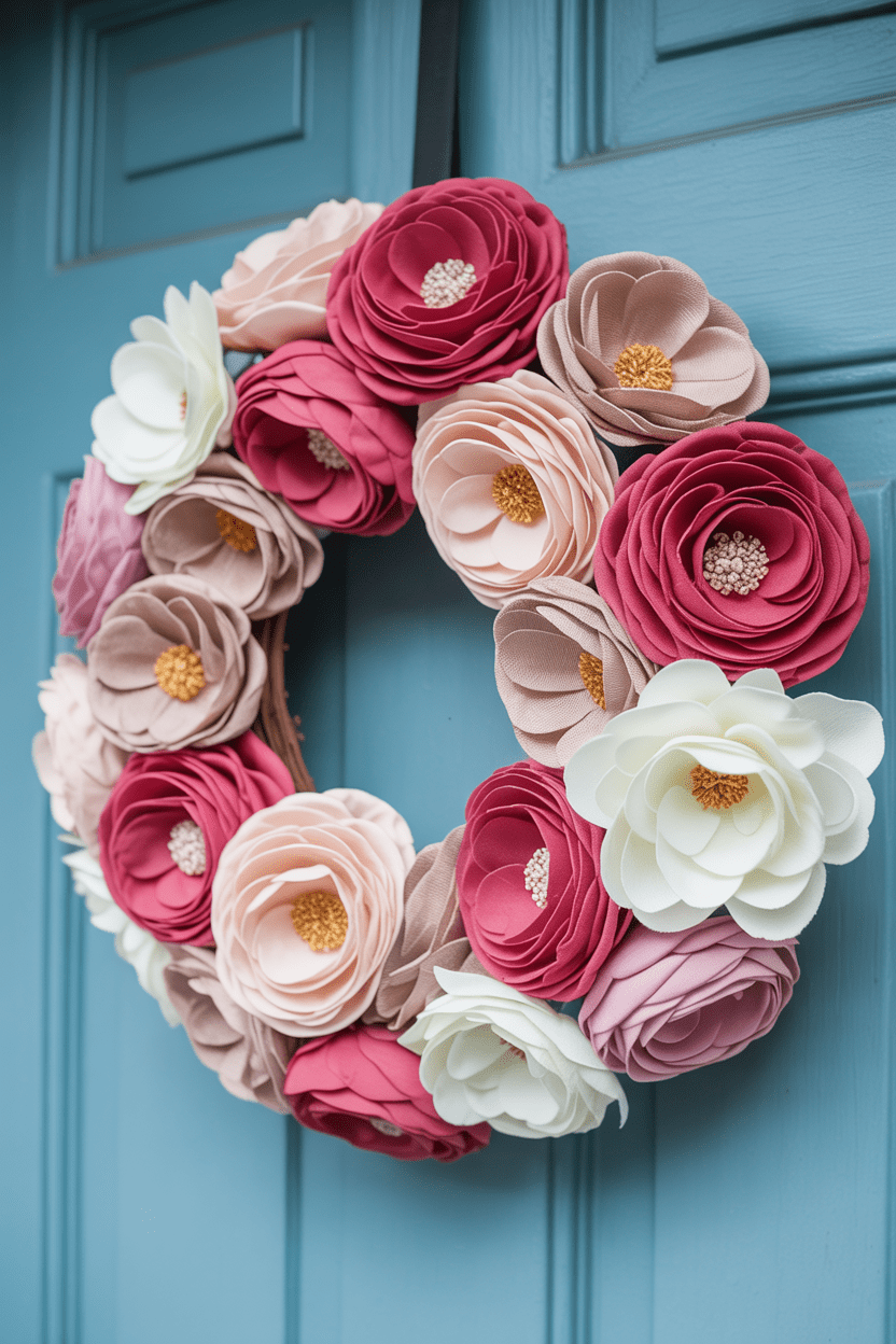 A fabric flower Valentine wreath gives you that perfect mix of color and creativity. Layer different fabric blooms—think cotton, linen, or velvet—to create a textured, full look. It’s a sweet way to reuse leftover fabric and make something truly personal.