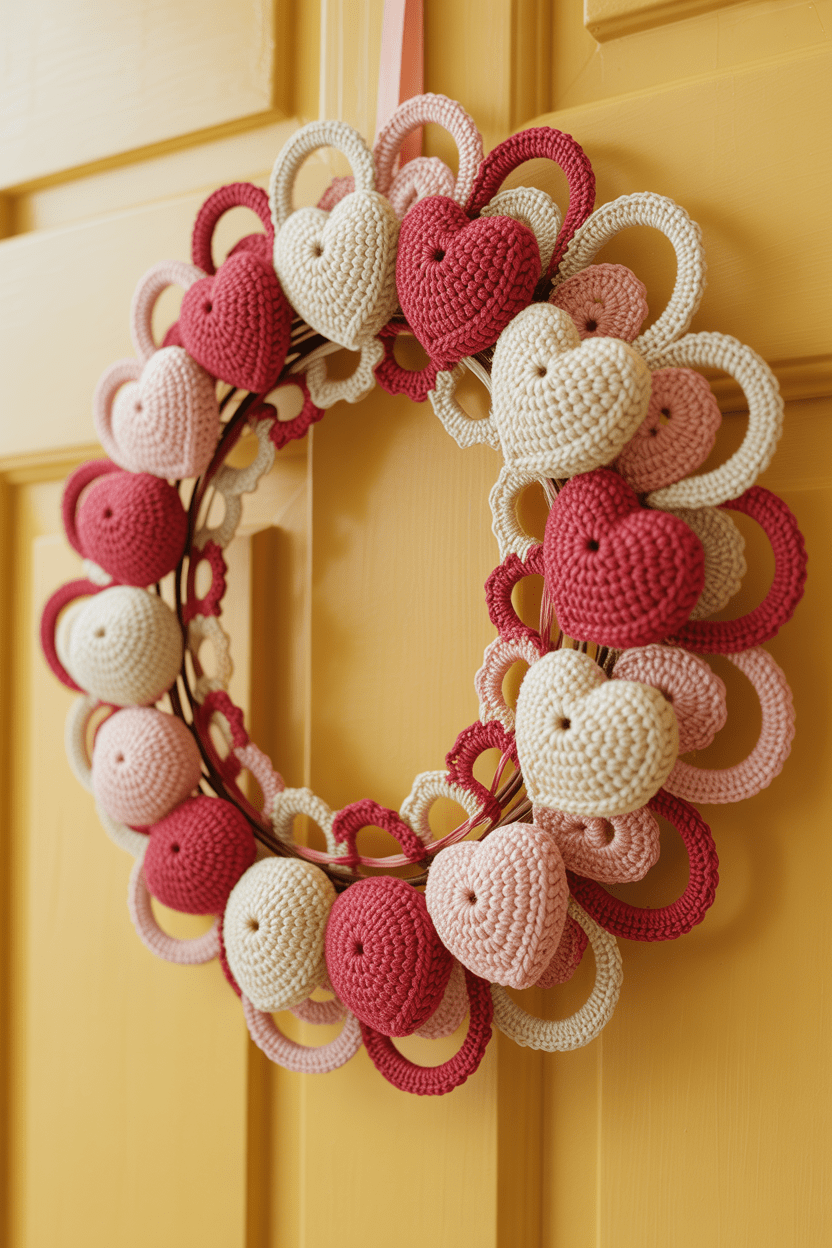 If you enjoy crochet projects, a crochet Valentine wreath adds such a delicate handmade touch. Think heart motifs, soft yarn colors, and maybe a bit of lace. It’s detailed, personal, and one of those decor pieces you’ll love bringing out year after year.