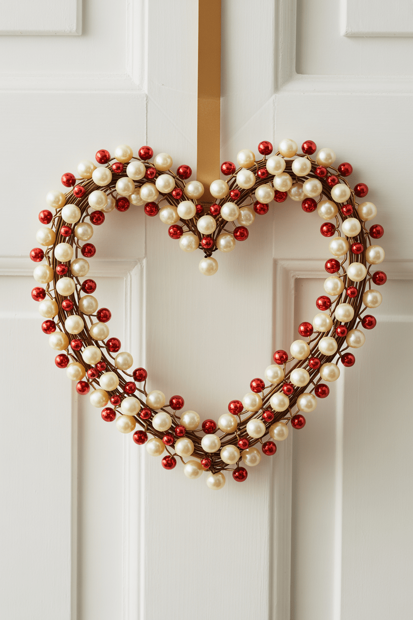A Valentine beaded wreath adds just the right amount of sparkle. Use pearls, beads, or shiny ornaments for a chic, glimmering effect. I love how it catches the light—it’s elegant, modern, and works beautifully as a front door statement piece.