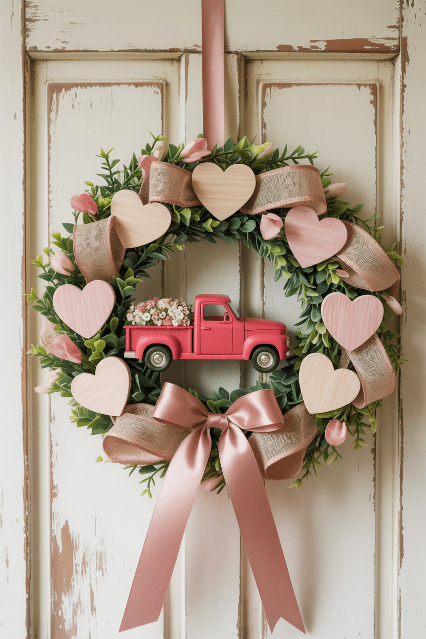 If you’re a farmhouse lover like me, this vintage Valentine ribbon truck wreath is pure charm. Picture soft pastel ribbons, a little red truck filled with hearts, and maybe even a touch of burlap. It’s nostalgic, sweet, and perfect for anyone who loves that cozy, country-inspired vibe.