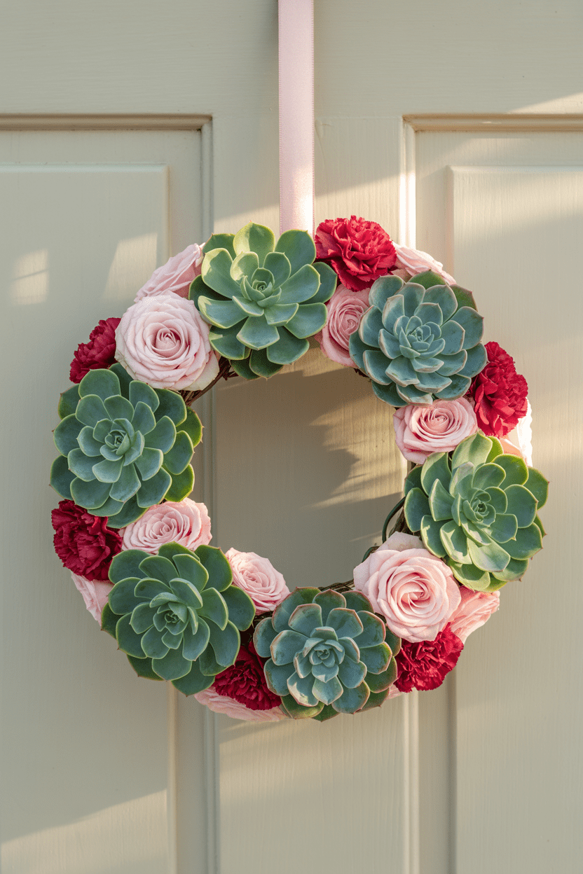 A succulent Valentine wreath is such a fun twist on the traditional. I like mixing real or faux succulents with small pink blooms for a natural, modern vibe. It’s fresh, unexpected, and perfect if you love greenery with a touch of romance.