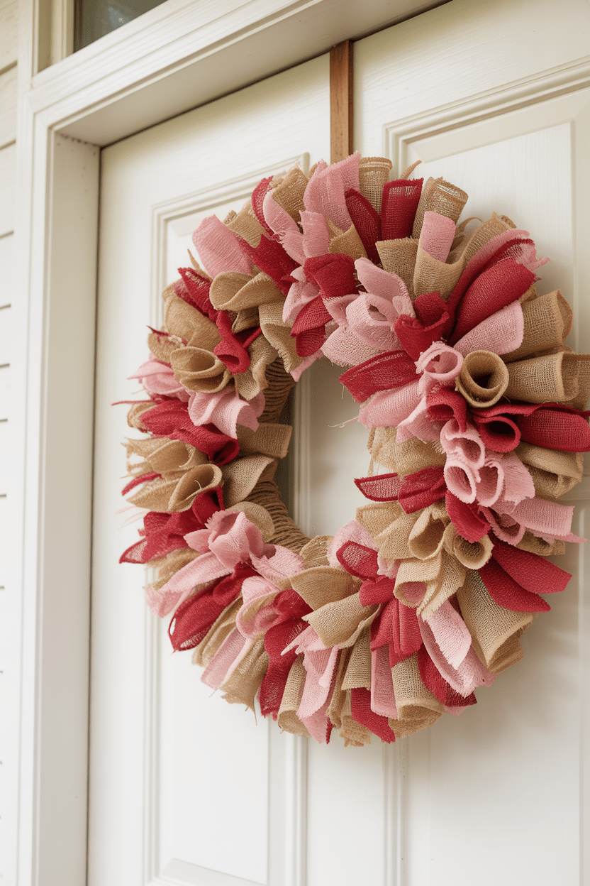 If you’re into farmhouse textures, a burlap Valentine ruffle wreath is right up your alley. Use strips of burlap in pink, cream, and red to create soft layers that feel warm and inviting. This look adds so much depth and texture to your front door.