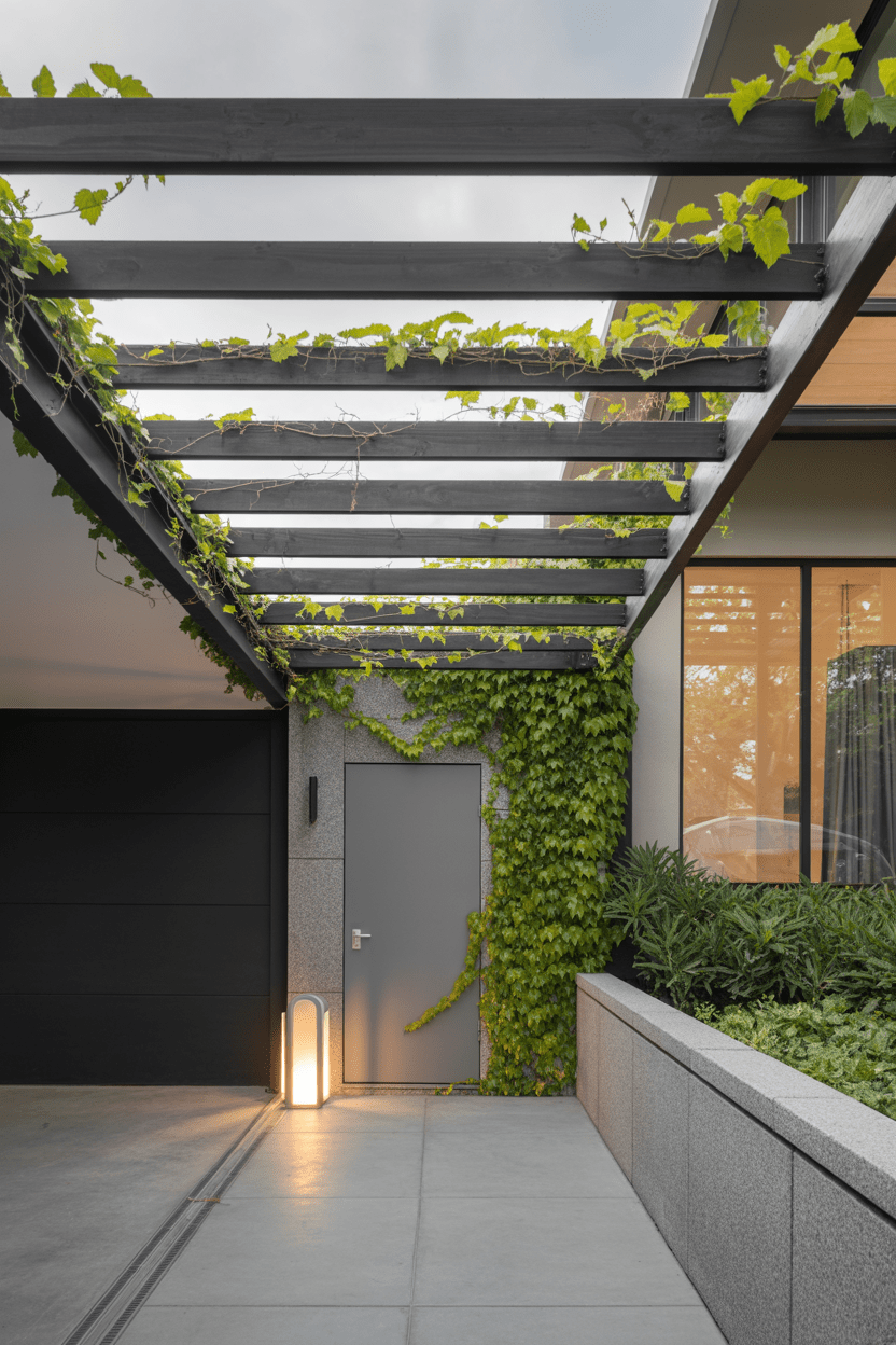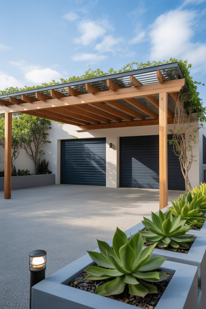 If you love the look of a pergola, why not bring that charm to your driveway? A modern pergola-style carport is such a statement-maker—especially when it’s set right in front of your garage. Think sleek beams, slatted wood, and even a few climbing vines to soften the structure. It gives you coverage and character.