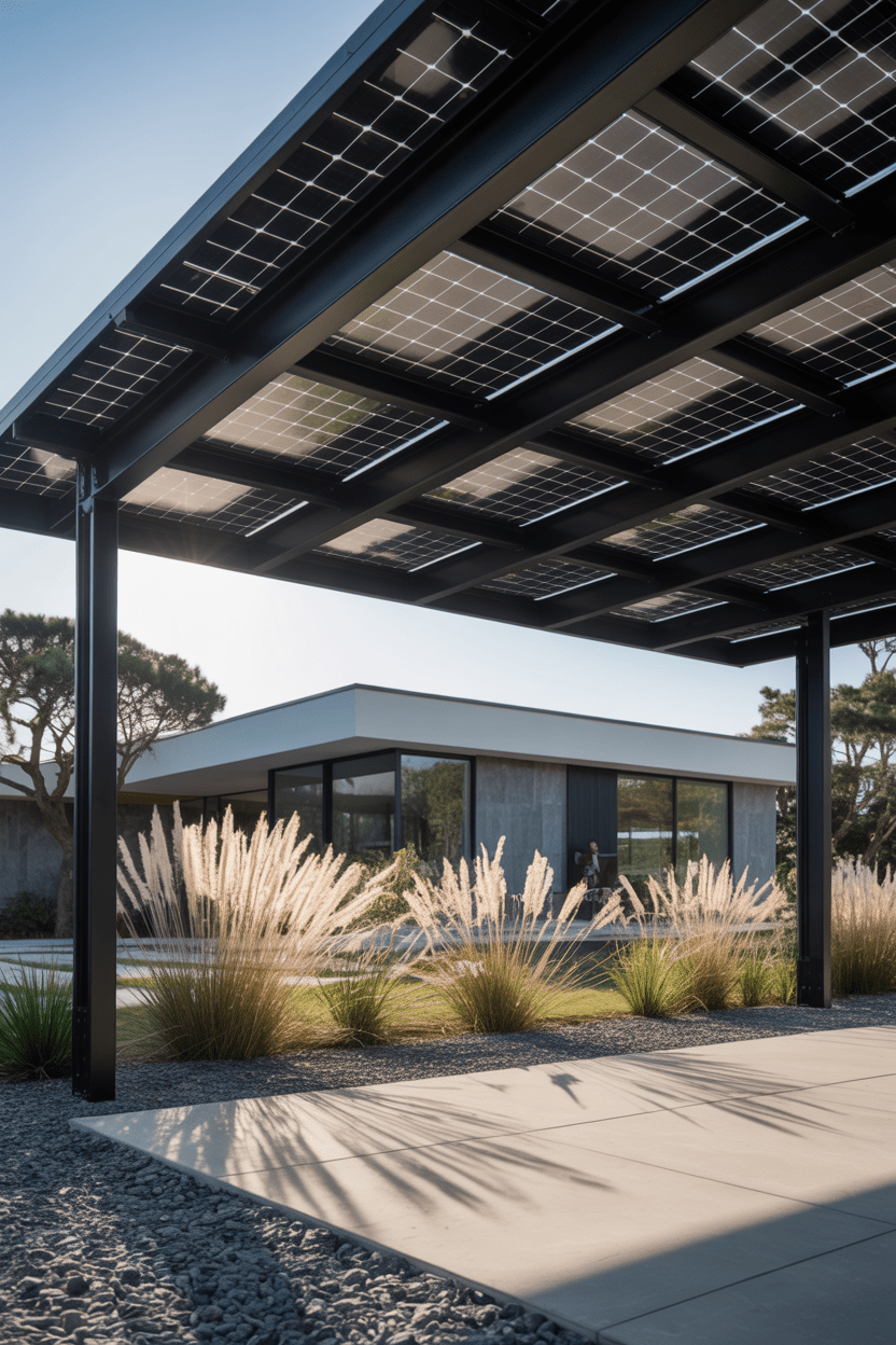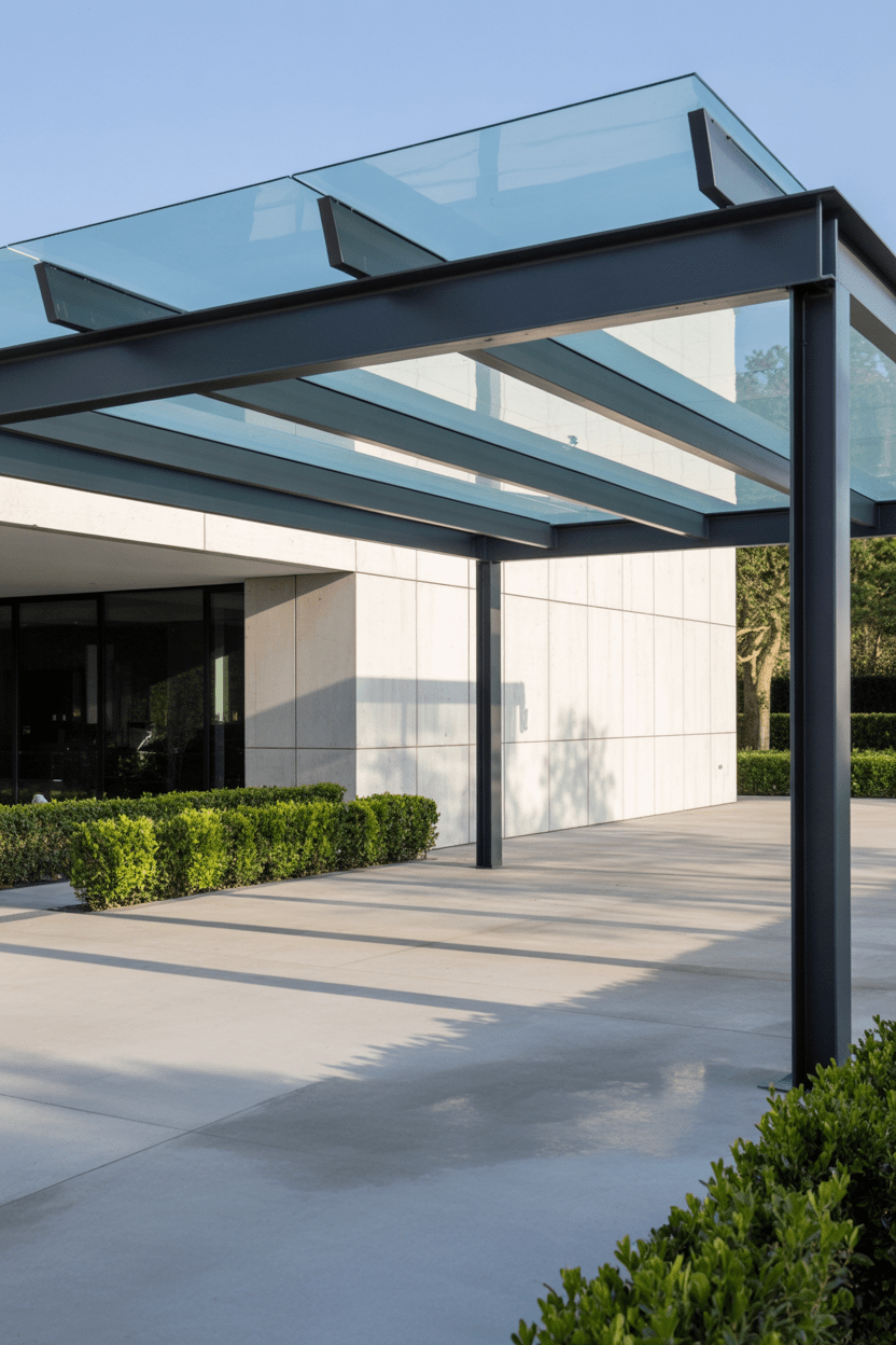There’s something so sophisticated about a glass roof. It protects without feeling heavy, and when paired with black steel framing, it adds a modern edge. This modern carport idea works beautifully with landscaping that’s clean and minimal, letting the structure shine.