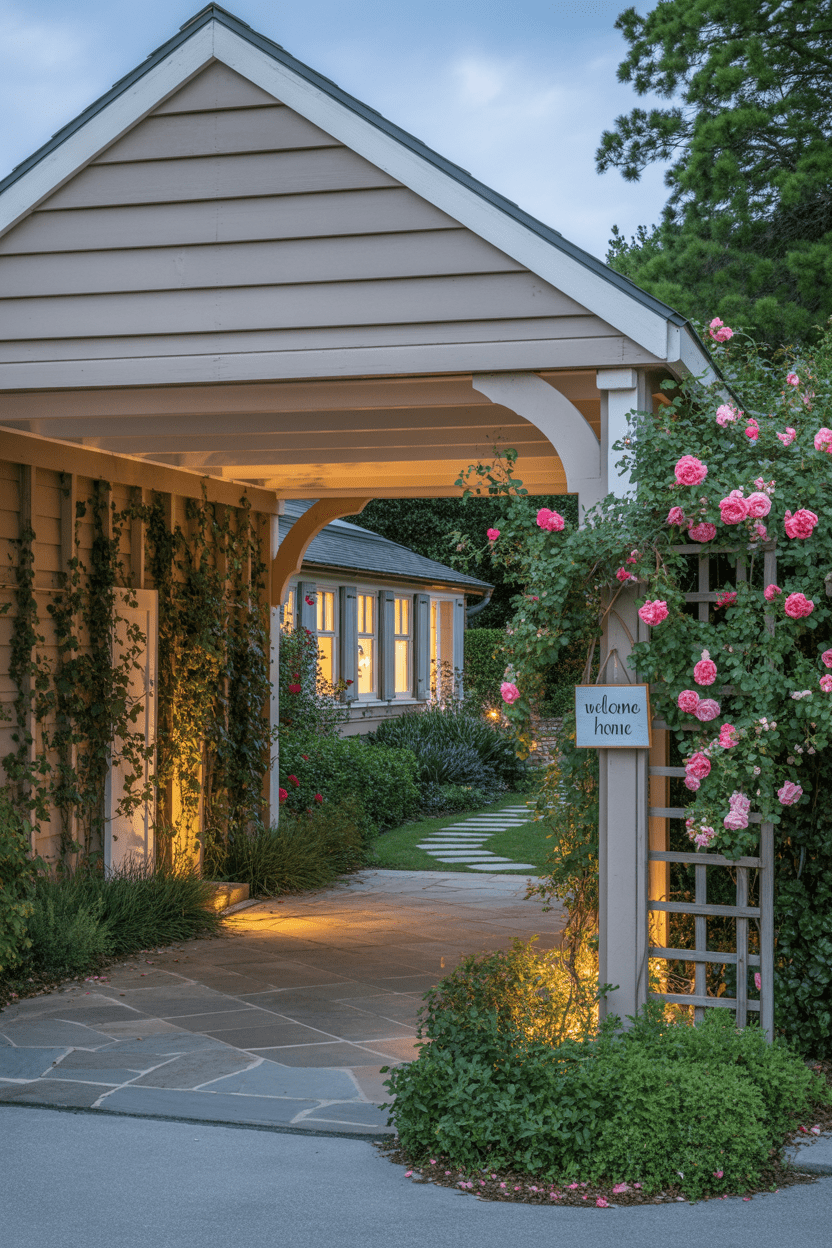 If your detached carport feels like an island, create a visual bridge with a breezeway or pathway to your house. Add a pergola roof, climbing vines, or even a vertical herb garden along the wall to make the walk feel lush and connected. It’s a simple touch that adds so much curb appeal.