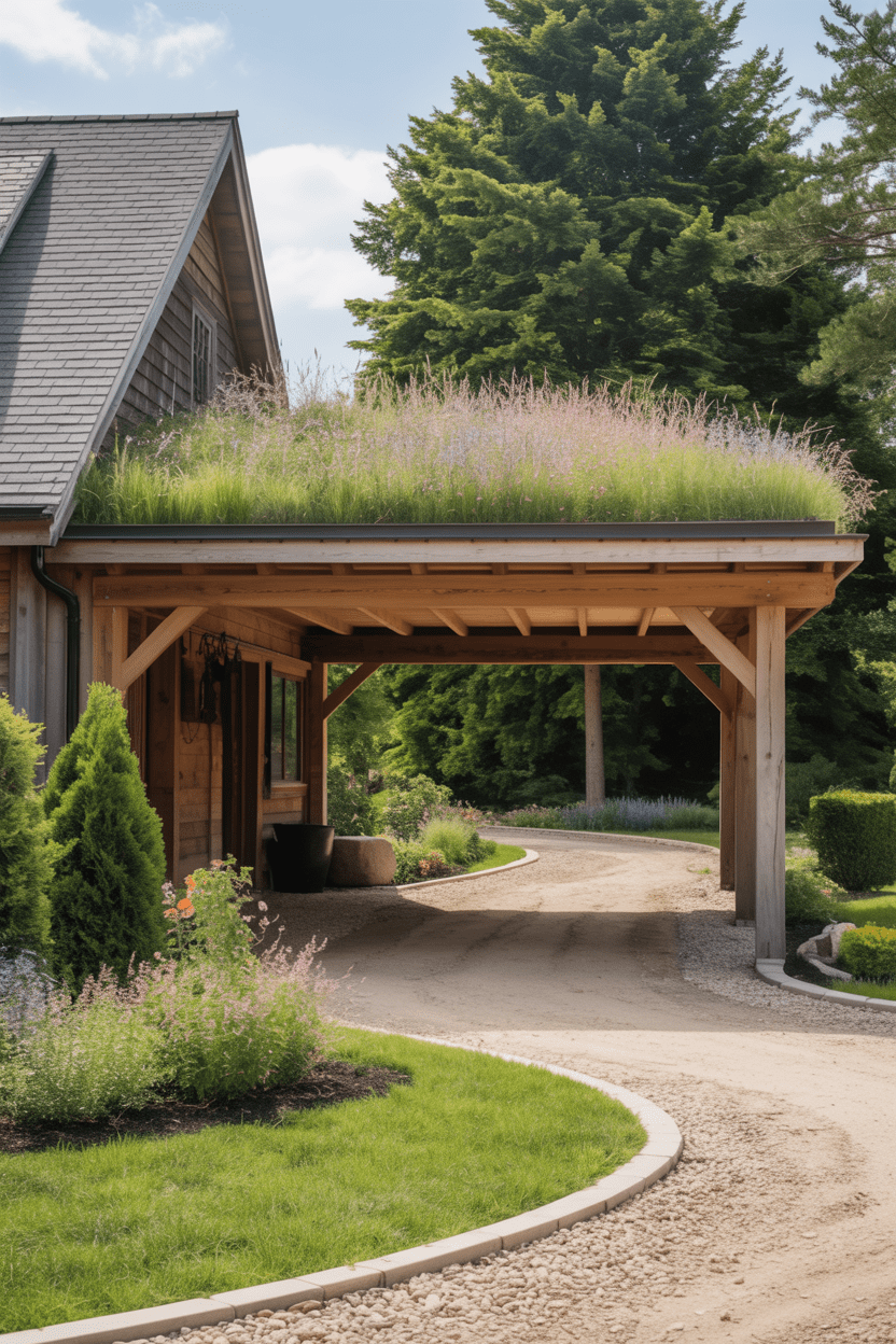 If you’re into more natural, earthy looks, a wood carport with a living green roof is a total dream. Not only does it blend beautifully into the landscape, but it’s also an eco-friendly option that adds texture and visual interest. Bonus points for surrounding it with garden beds or gravel paths.