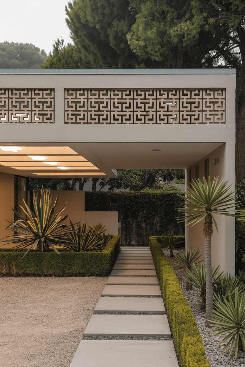 There’s something so effortlessly cool about a mid-century modern carport. Flat roof, breeze block walls, and a little breezeway connecting it to the house? Sure thing. It adds that retro vibe while keeping the structure light and open. This look pairs beautifully with desert landscaping or succulents.
