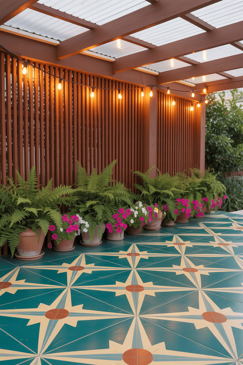 Sometimes you don’t need to rebuild—you just need a refresh. I love a good makeover, and painting the floor with a bold pattern or faux tile stencil can completely transform the vibe. Add vertical wood slats on one or two sides for privacy and warmth, and suddenly it feels like a brand new space.