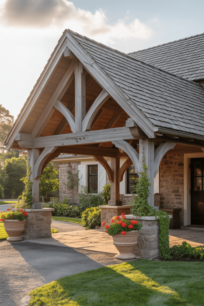 This one’s for my fellow farmhouse lovers. A timber frame carport with chunky wood beams, a steep gable roof, and maybe even some stone columns feels rustic and inviting. It looks like it was meant to be part of the home and gives instant cozy charm.