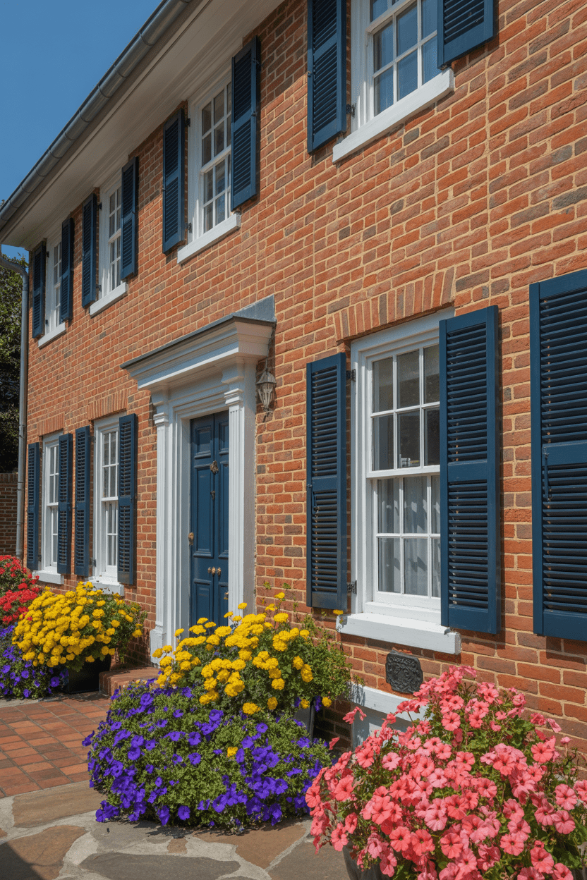 10. Red brick house exterior with navy or deep blue accents
