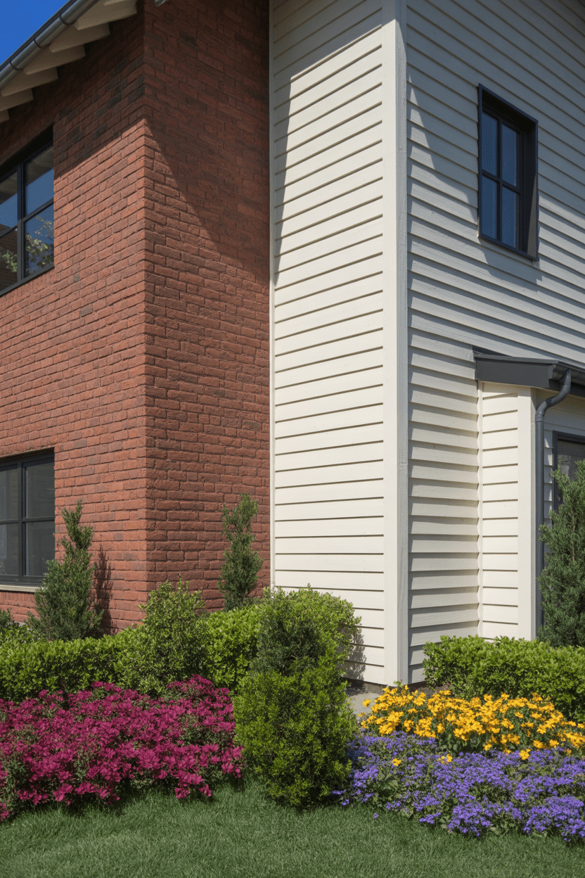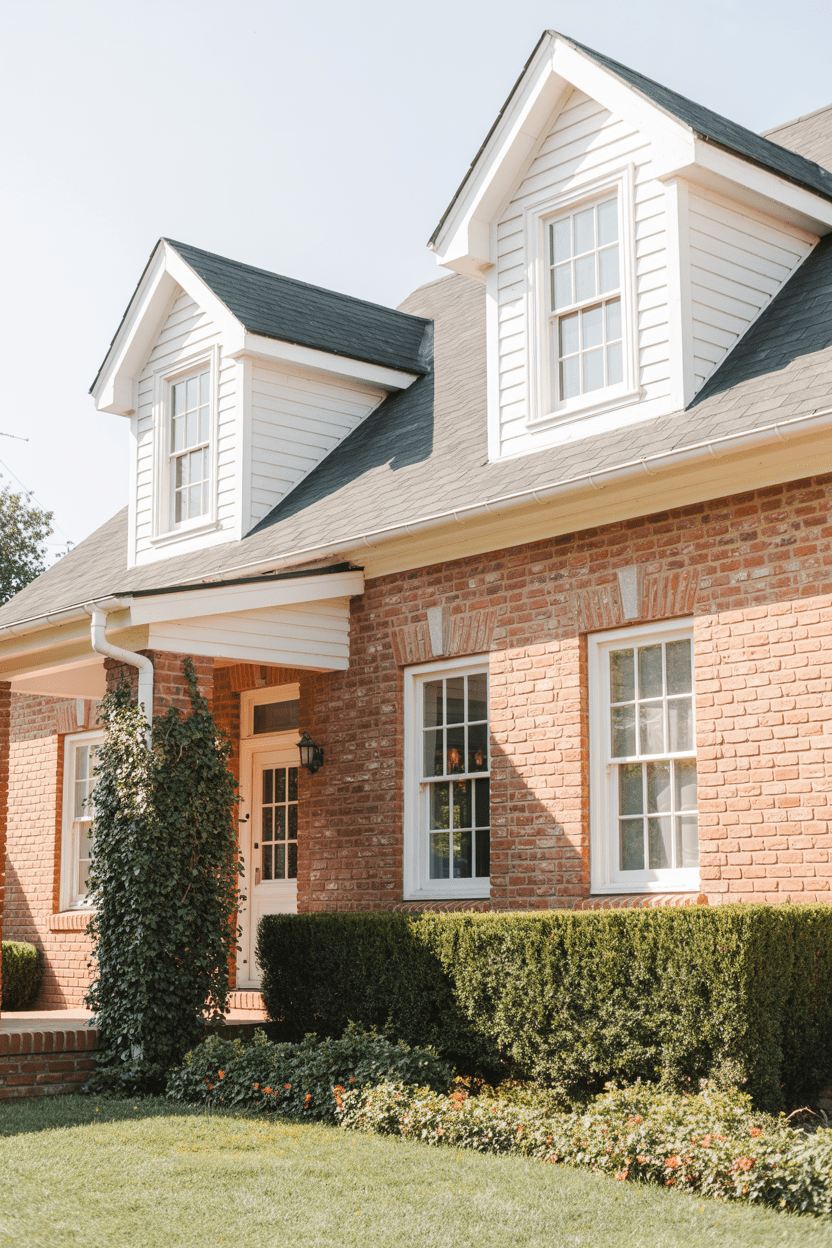Adding white siding to dormers, porches, or upper stories helps brighten and balance a darker red brick exterior. It’s such a simple update that makes the whole home feel lighter and fresher.