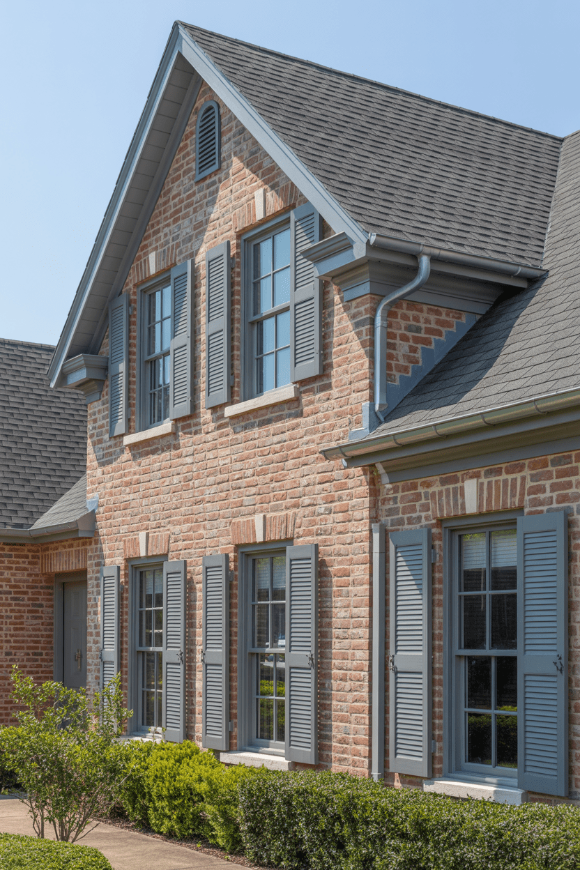 Gray works beautifully with nearly every shade of red brick, making it perfect for trim, shutters, siding, or even roof updates. It’s one of the most versatile color schemes if you want something modern but not too trendy.