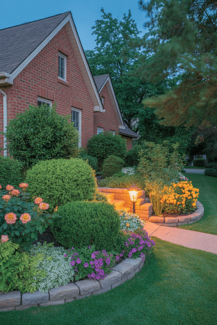 One of my favorite ways to enhance red brick is simply through thoughtful landscaping. Layered shrubs, soft lighting, stone borders, and lush greenery add texture and charm that ties beautifully into the warm tones of brick.
