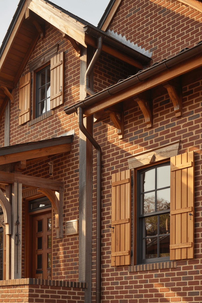 Wood and red brick were meant to be together. Cedar beams, natural wood shutters, or a wood-tone garage door add warmth, balance, and a hint of rustic charm. This combo feels especially lovely in more natural or suburban settings.