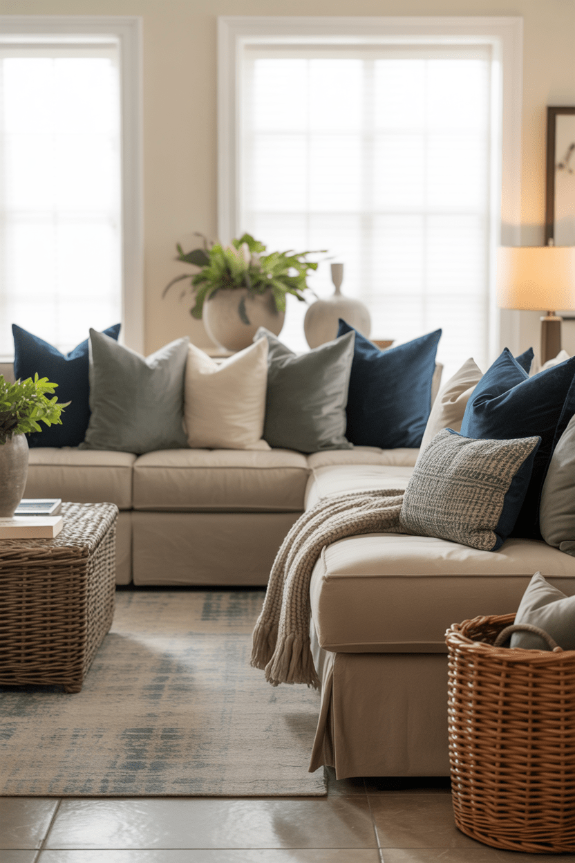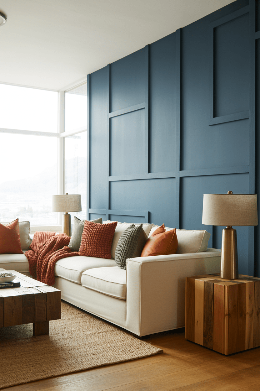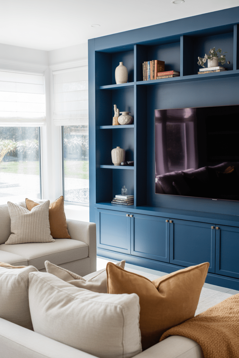 Blue family room ideas paired with neutral tones feel calming, timeless, and easy to live with. Using blue on accent walls, pillows, or rugs adds depth while keeping the overall space balanced and inviting.