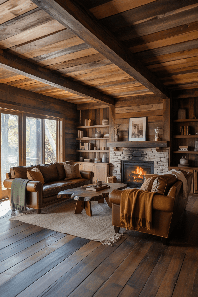 Rustic family room ideas bring instant warmth through natural materials like wood, stone, and leather. These elements create a grounded, inviting atmosphere, and mixing rustic finishes with soft textiles keeps the room cozy rather than heavy.
