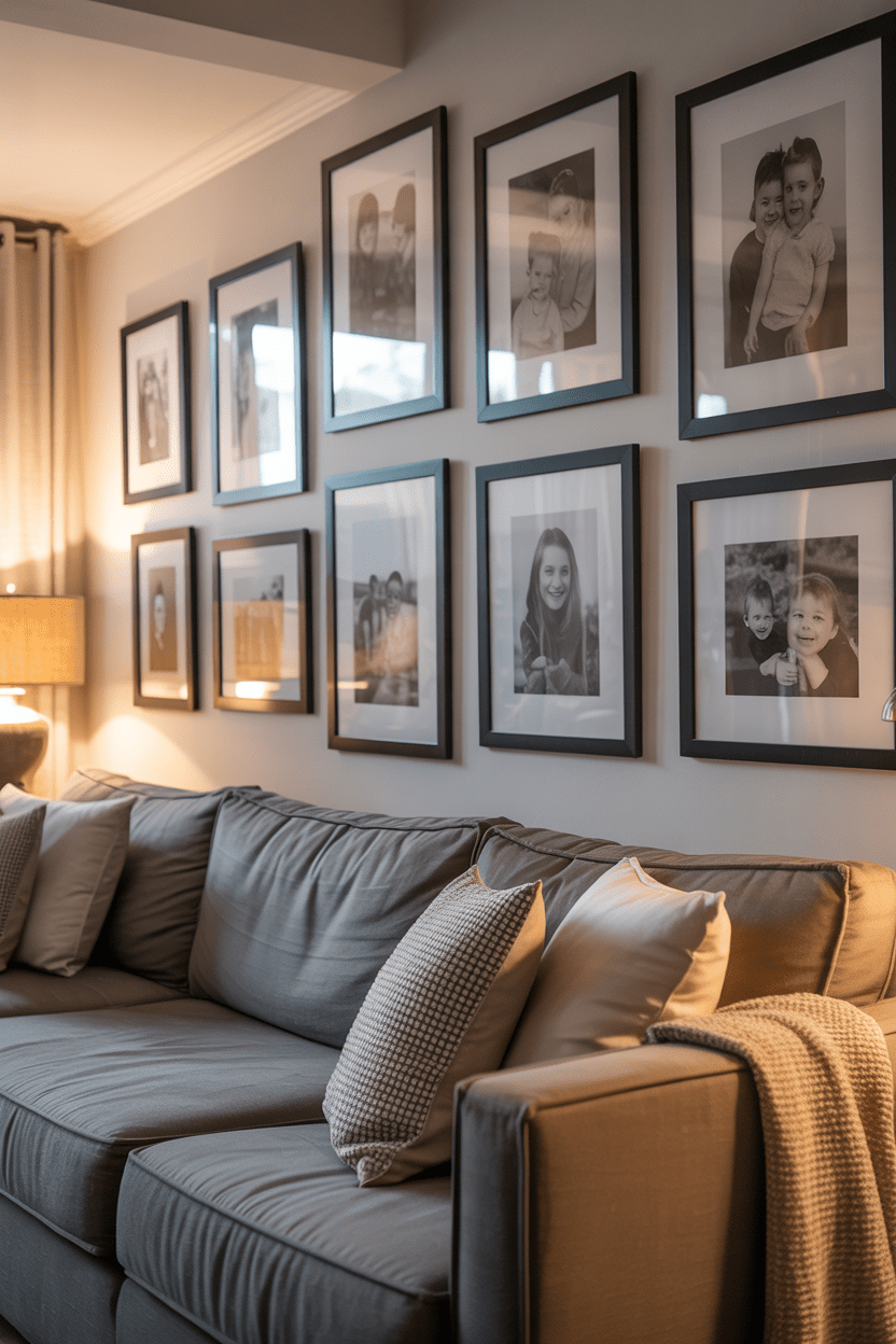 Gallery walls are a beautiful way to personalize a family room and make it feel lived-in. Family room wall decor ideas that include family photos add warmth and character, and keeping frames cohesive helps the display feel intentional instead of cluttered.