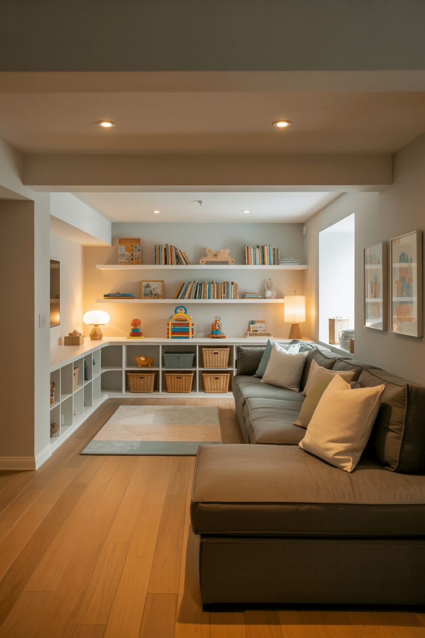 Combining a playroom with a family room is a smart way to maximize space, especially in a basement. Basement playroom and family room combo ideas work best when storage is built in and zones are clearly defined to keep toys contained while adults still enjoy the space.