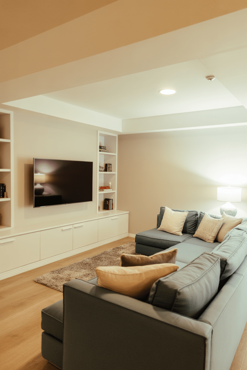Small basement family room ideas benefit greatly from smart storage solutions that keep clutter out of sight. Built-in cabinets or shelving help the space feel intentional and organized, and lighter colors can make the basement feel brighter and more open.