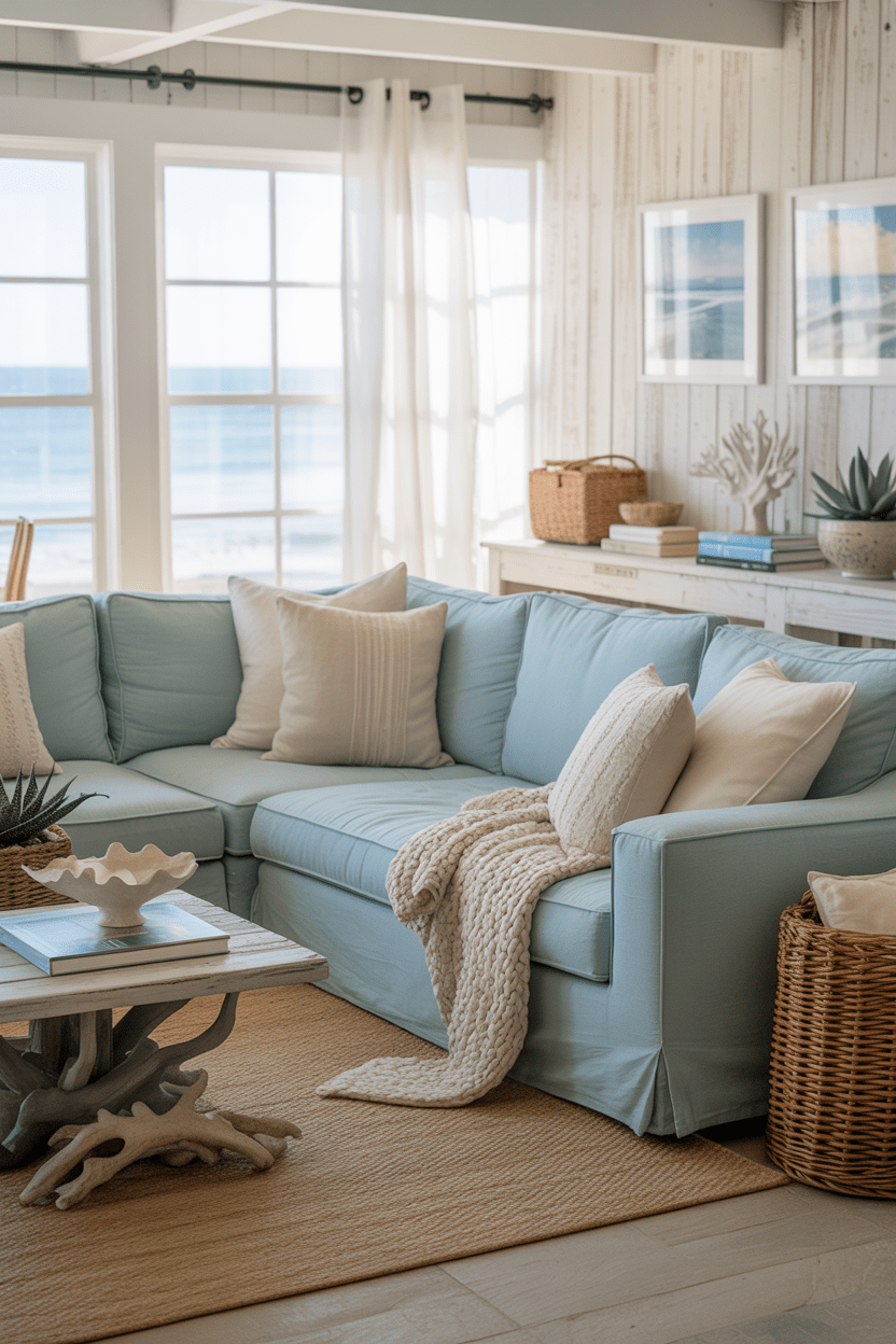 Coastal family room ideas are perfect if you love a relaxed, breezy feel. Light colors, natural textures, and casual furniture create an effortless atmosphere that’s ideal for warm and cozy gatherings, no matter where you live.