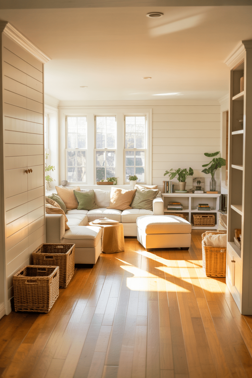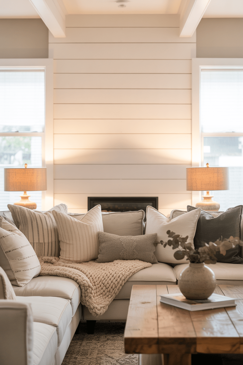 Modern farmhouse family room ideas continue to be popular because they feel warm, timeless, and incredibly livable. A shiplap accent wall adds texture and charm without overwhelming the space, and pairing it with neutral colors, comfy sofas, and natural wood accents keeps the family room relaxed and welcoming.