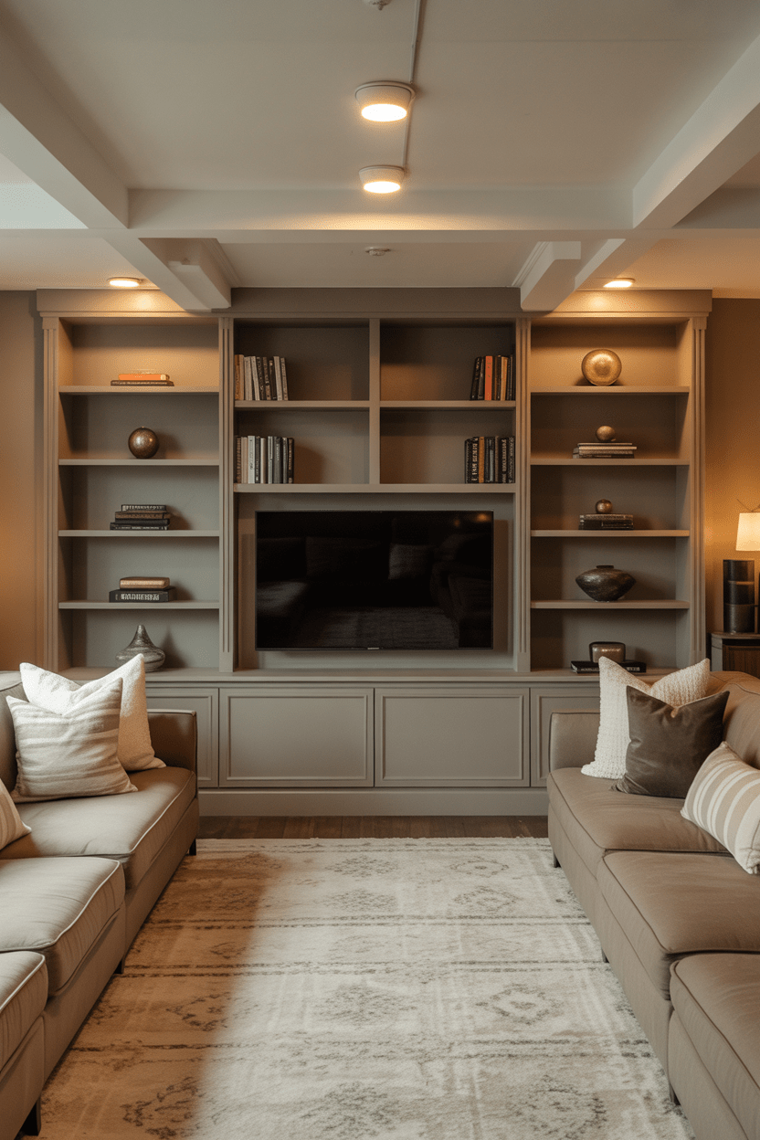 Basement family room ideas are perfect for creating a relaxed hangout space that doesn’t need to feel formal. Built-in entertainment centers help anchor the room and provide storage for games, movies, and electronics, which is especially helpful in finished basement family rooms where function is key. Warm wood tones or soft paint colors keep the space from feeling dark or cave-like.