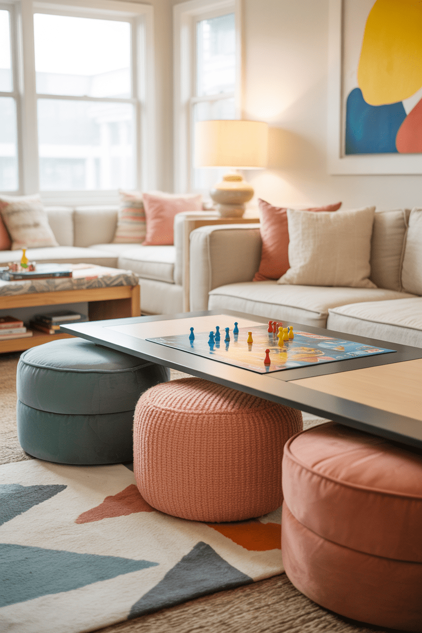 Family game room ideas work best when seating is flexible, making it easy to move pieces around as needed. Ottomans, benches, and poufs allow the room to transition effortlessly from game night to movie night, which is especially useful in family rooms that double as entertainment spaces.