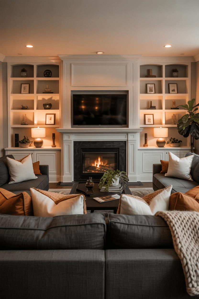 Nothing says warm and cozy gatherings like a fireplace paired with a comfortable sectional sofa. This setup encourages everyone to gather in one place, whether it’s for movie night or quiet evenings at home, and cozy family room ideas really shine when seating wraps around the space and faces the fire. Choosing a deep, plush sectional and layering in throw blankets and pillows makes the room feel extra inviting.