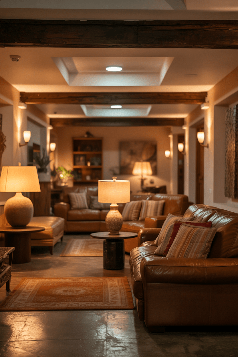 Lighting can make or break a basement family room, and cozy basement family room ideas rely on layered lighting to feel inviting. Lamps, sconces, and warm overhead fixtures help counteract the lack of natural light, and avoiding harsh recessed lighting alone creates a softer, more comfortable glow.