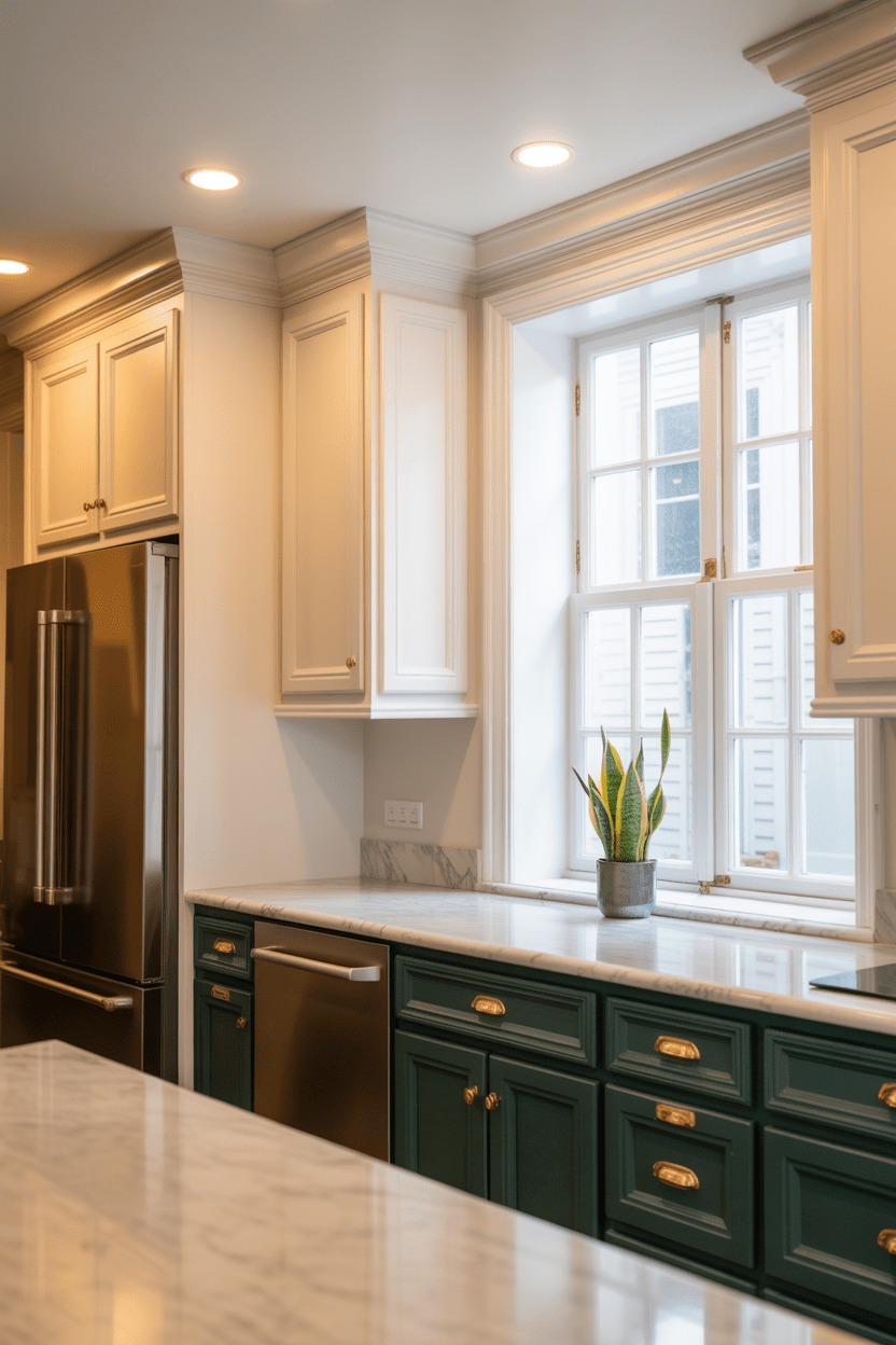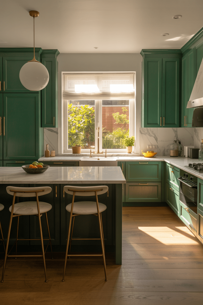 Emerald green kitchen cabinets instantly make a statement and exude luxury. Pairing them with polished brass hardware creates a striking contrast that feels both modern and elegant. To achieve this look, focus on deep, jewel-toned cabinetry and consider adding marble countertops for a high-end finish.