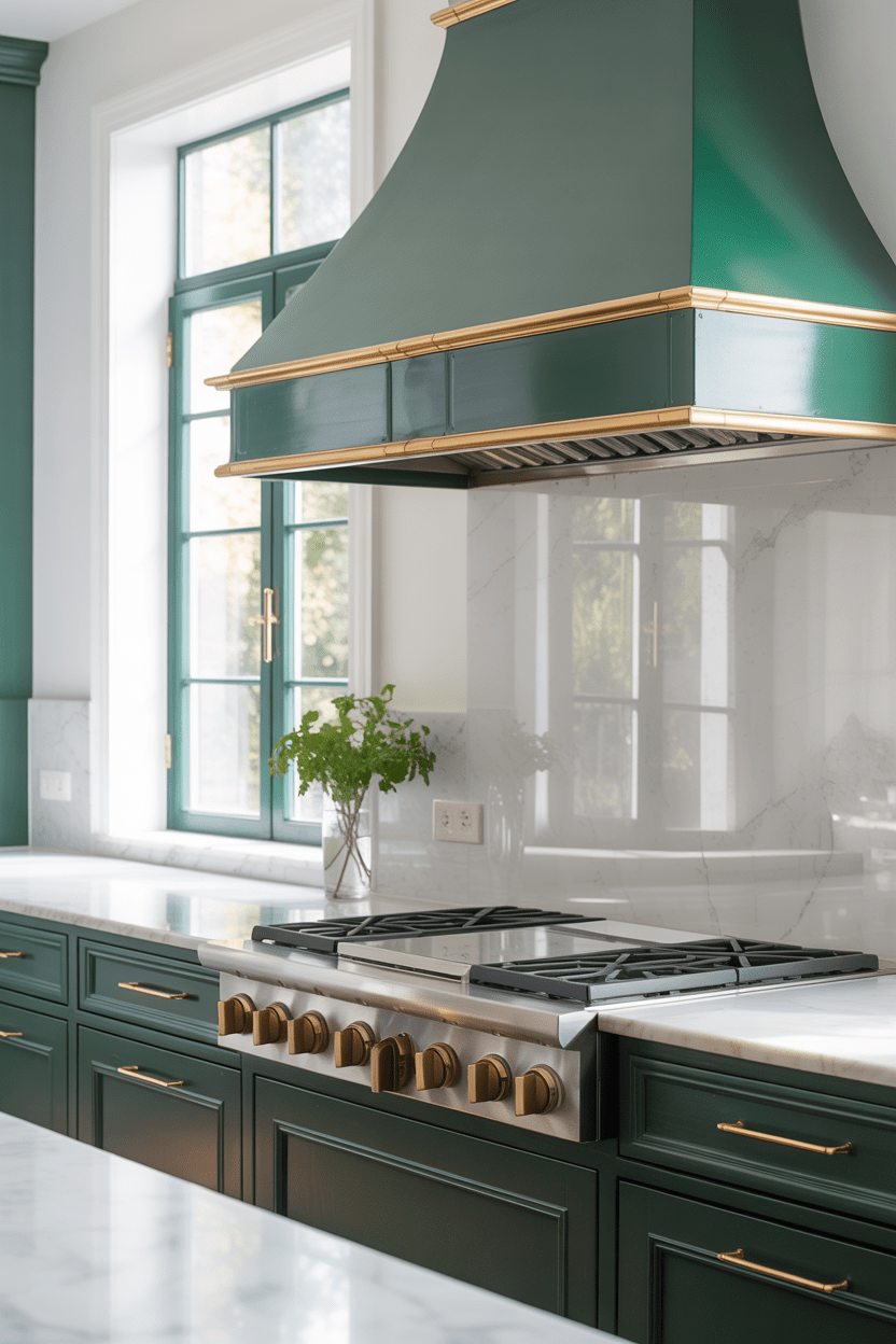 Making your range hood a focal point in a green kitchen can be incredibly dramatic. Emerald or deep green paired with brass detailing draws the eye upward, adding glamour and sophistication. Balance it with neutral counters and backsplash for maximum impact.