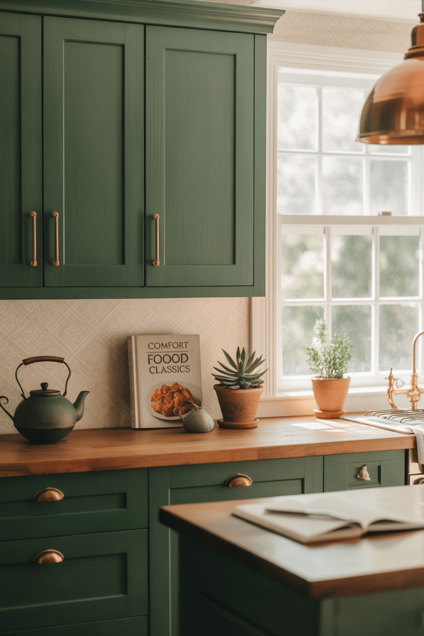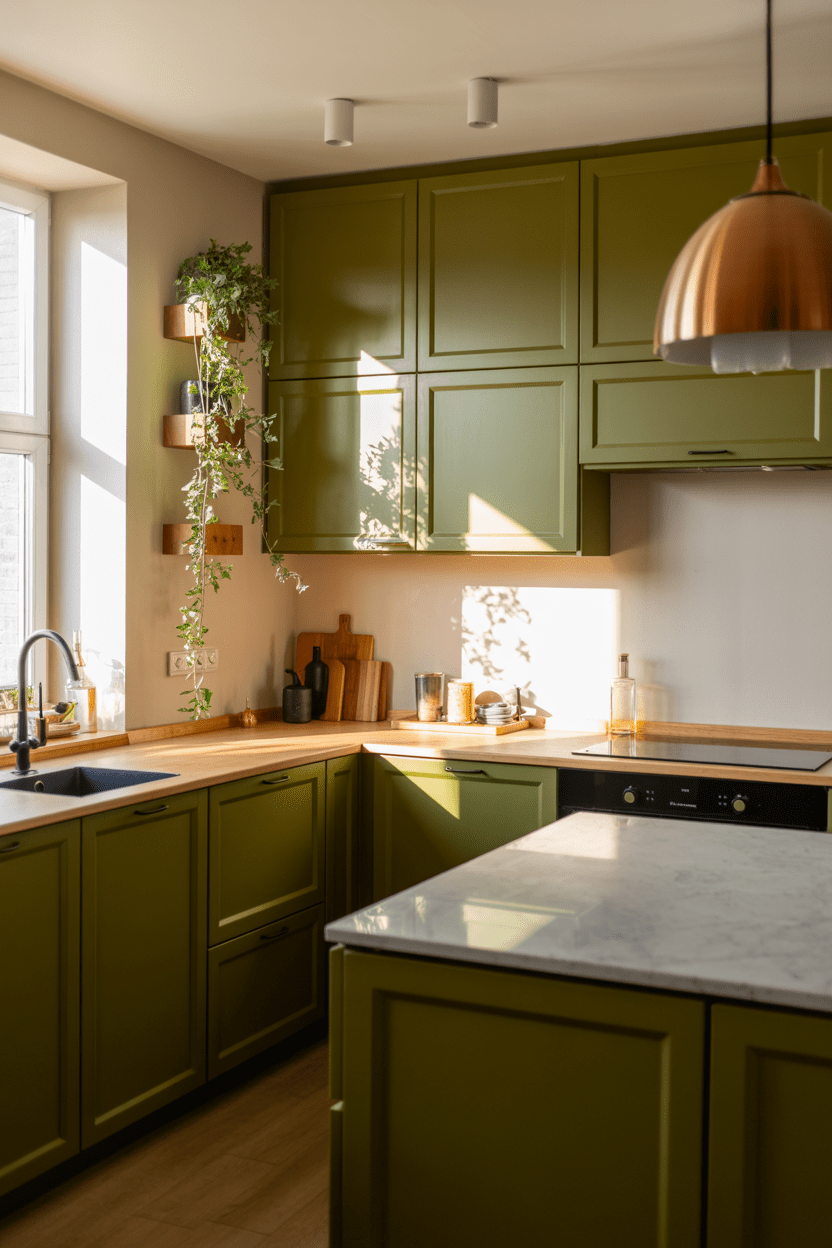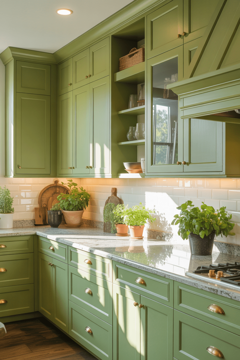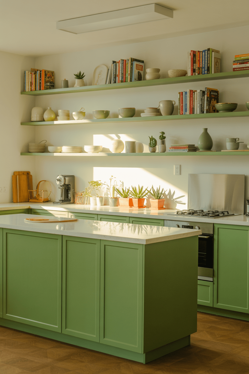 Green cabinets combined with open shelves and copper accents bring warmth and style. Copper pendant lights or hardware pop against green cabinetry, making your kitchen look curated and designer-inspired.